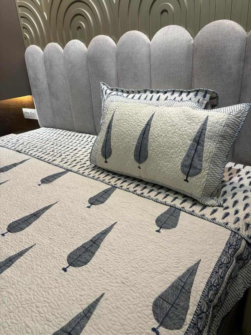 White and Grey Leaves Handblock Quilted Reversible Bedcover with 2 Pillow Covers – Elegant and Eco-Friendly Bedding