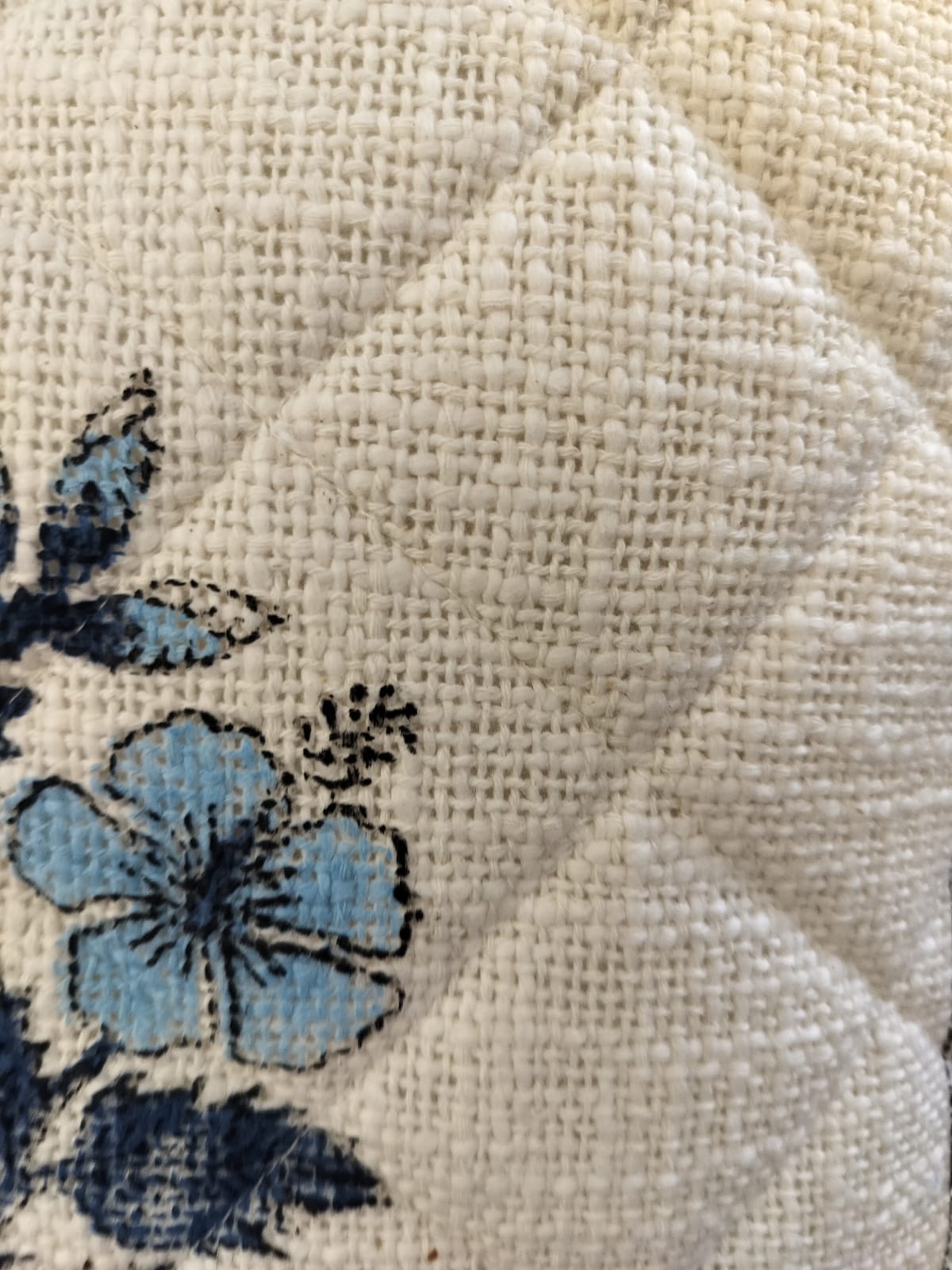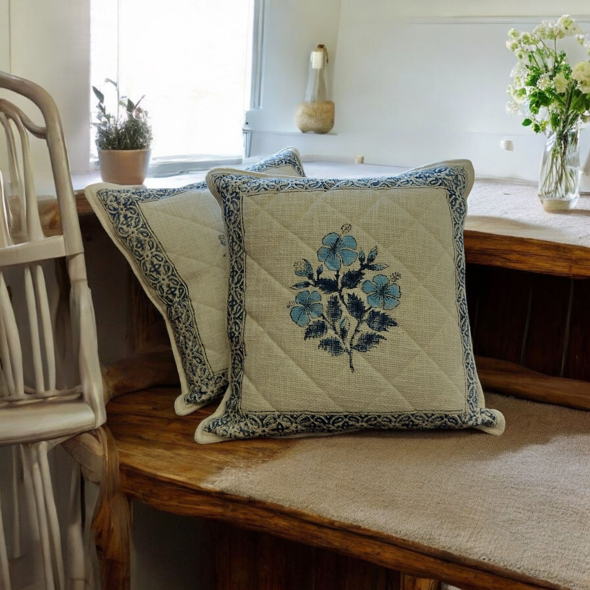 White Blue Flower Quilted Jute Cushion Cover SET OF 2