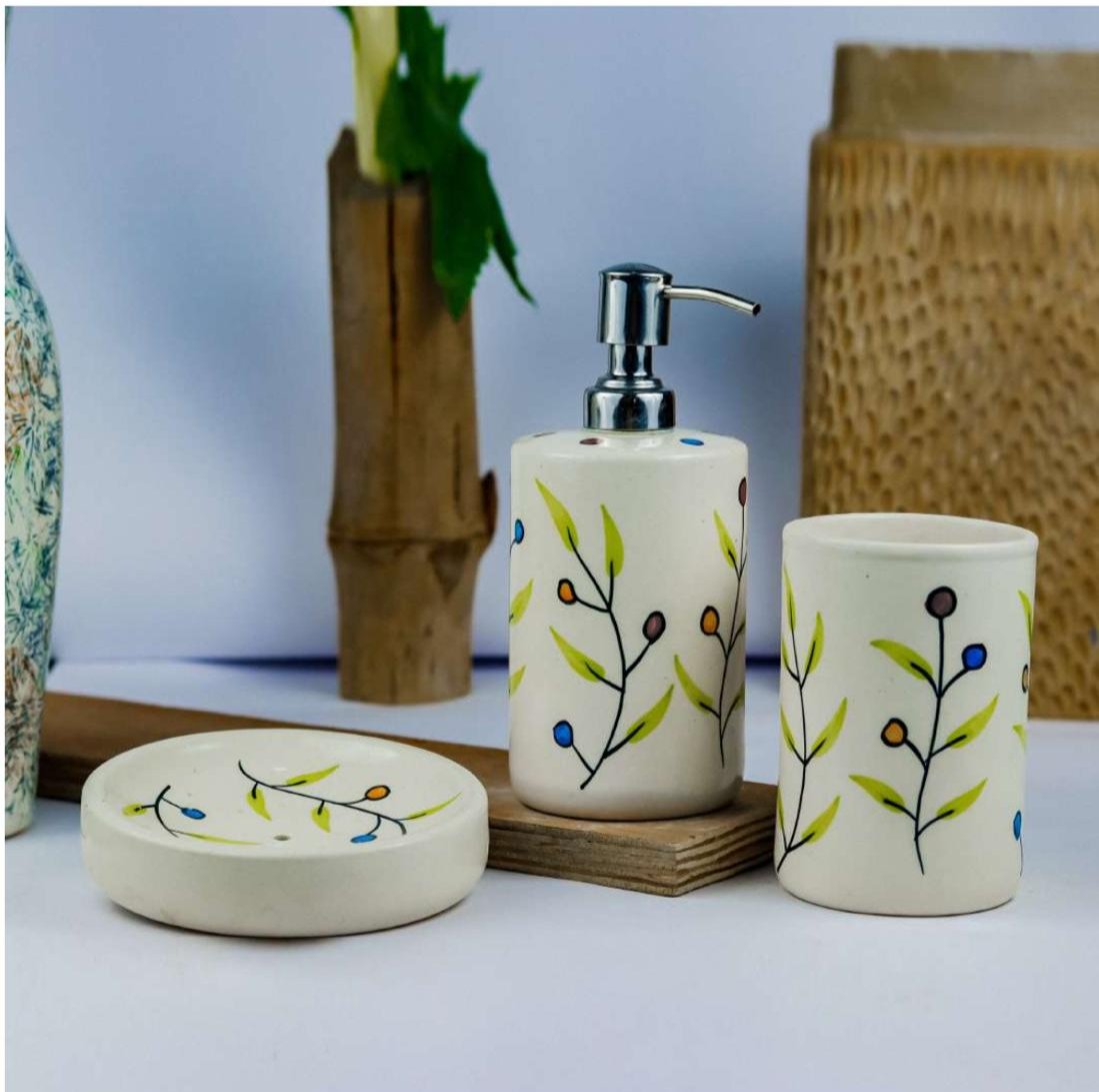 White Floral Ceramic Bathroom Set – 3-Piece Elegant Bathroom Accessories