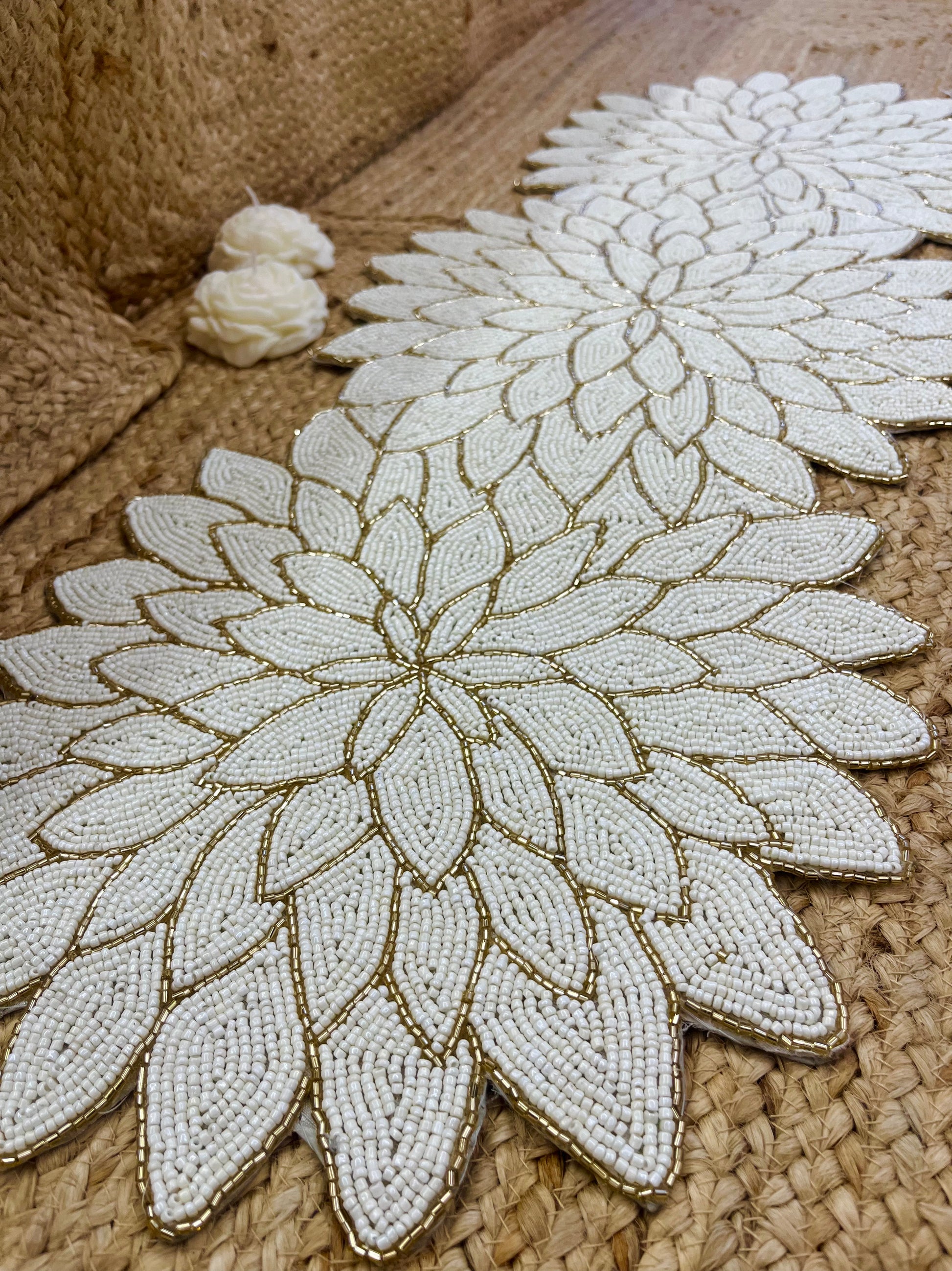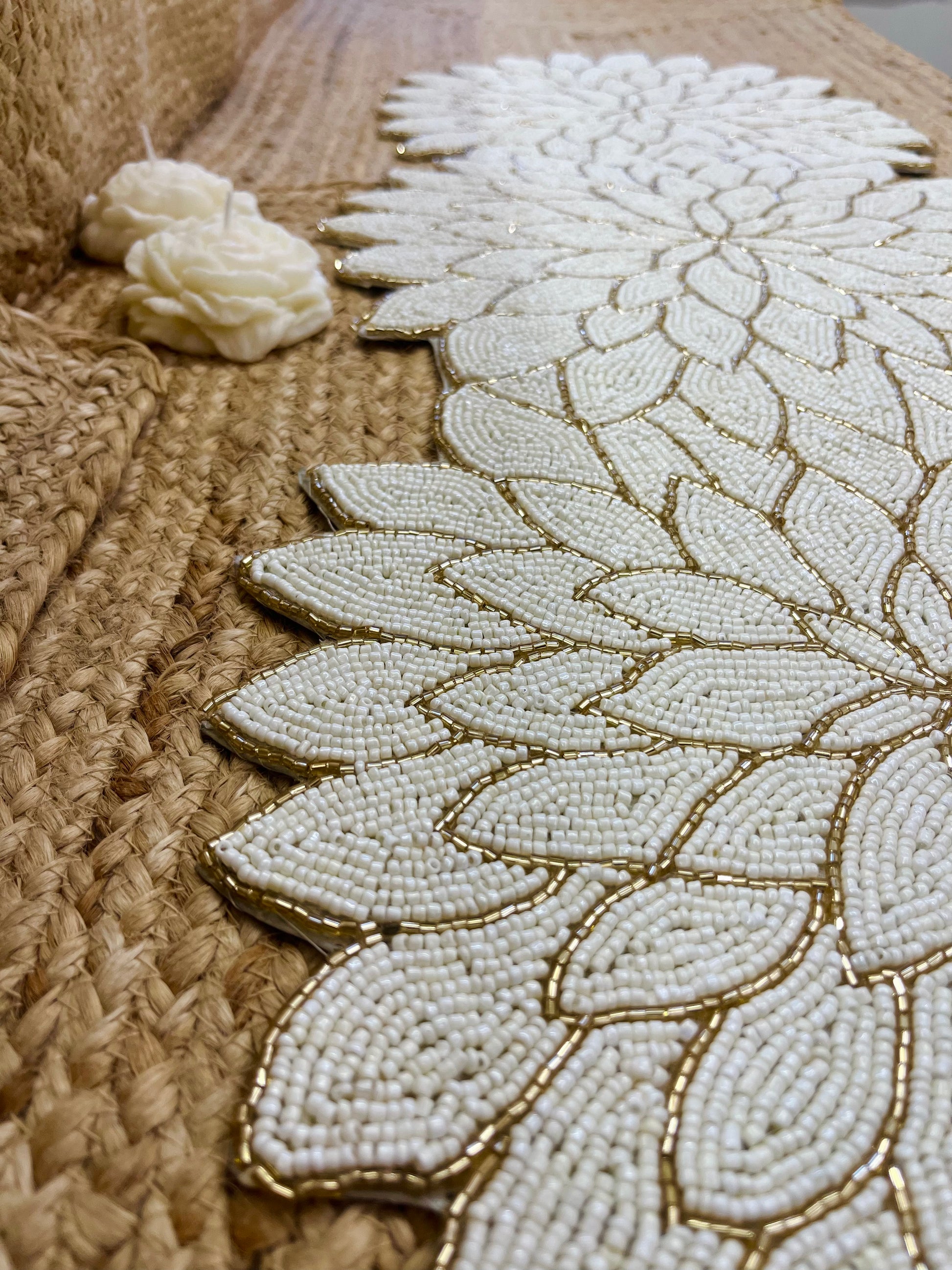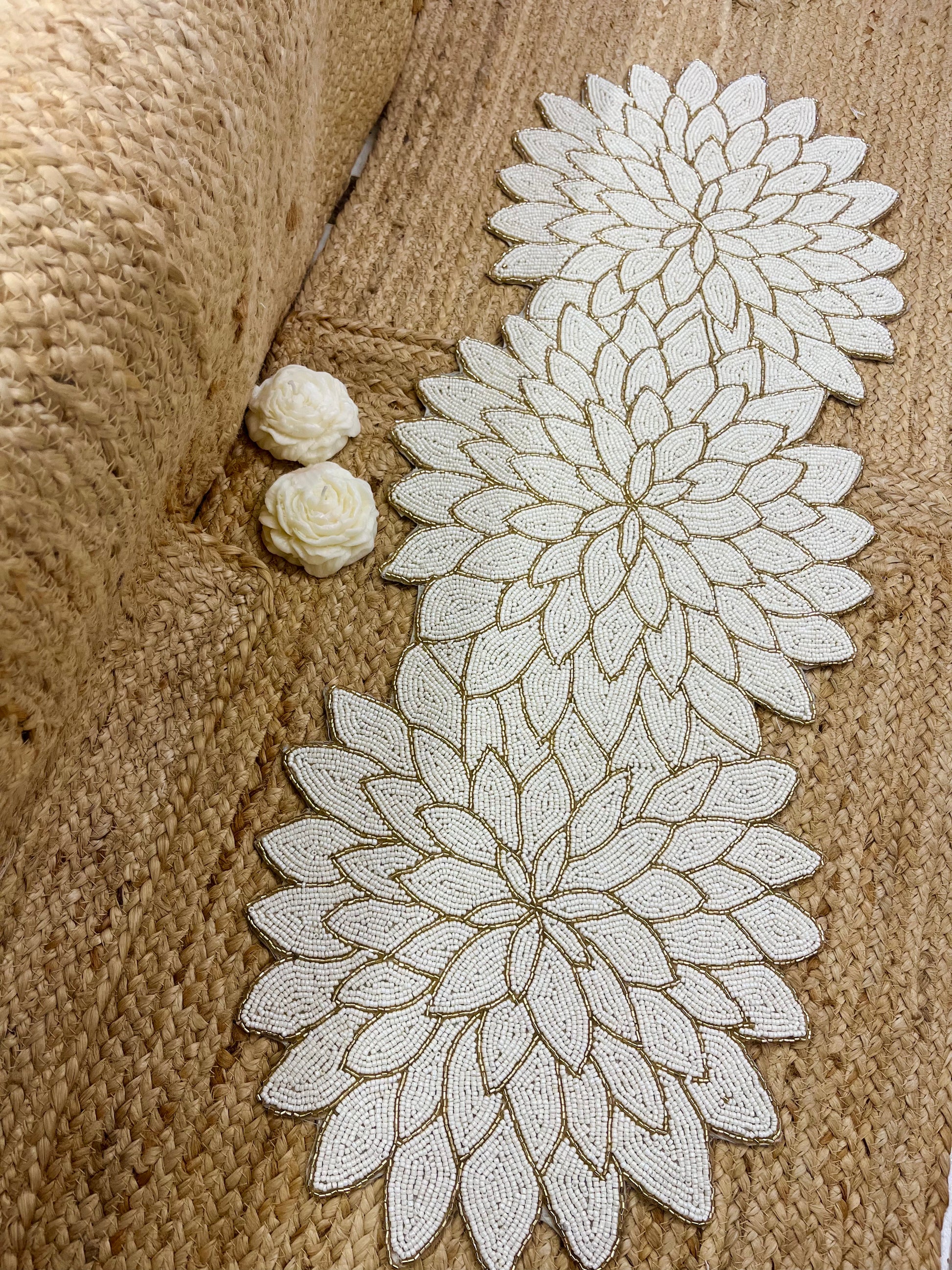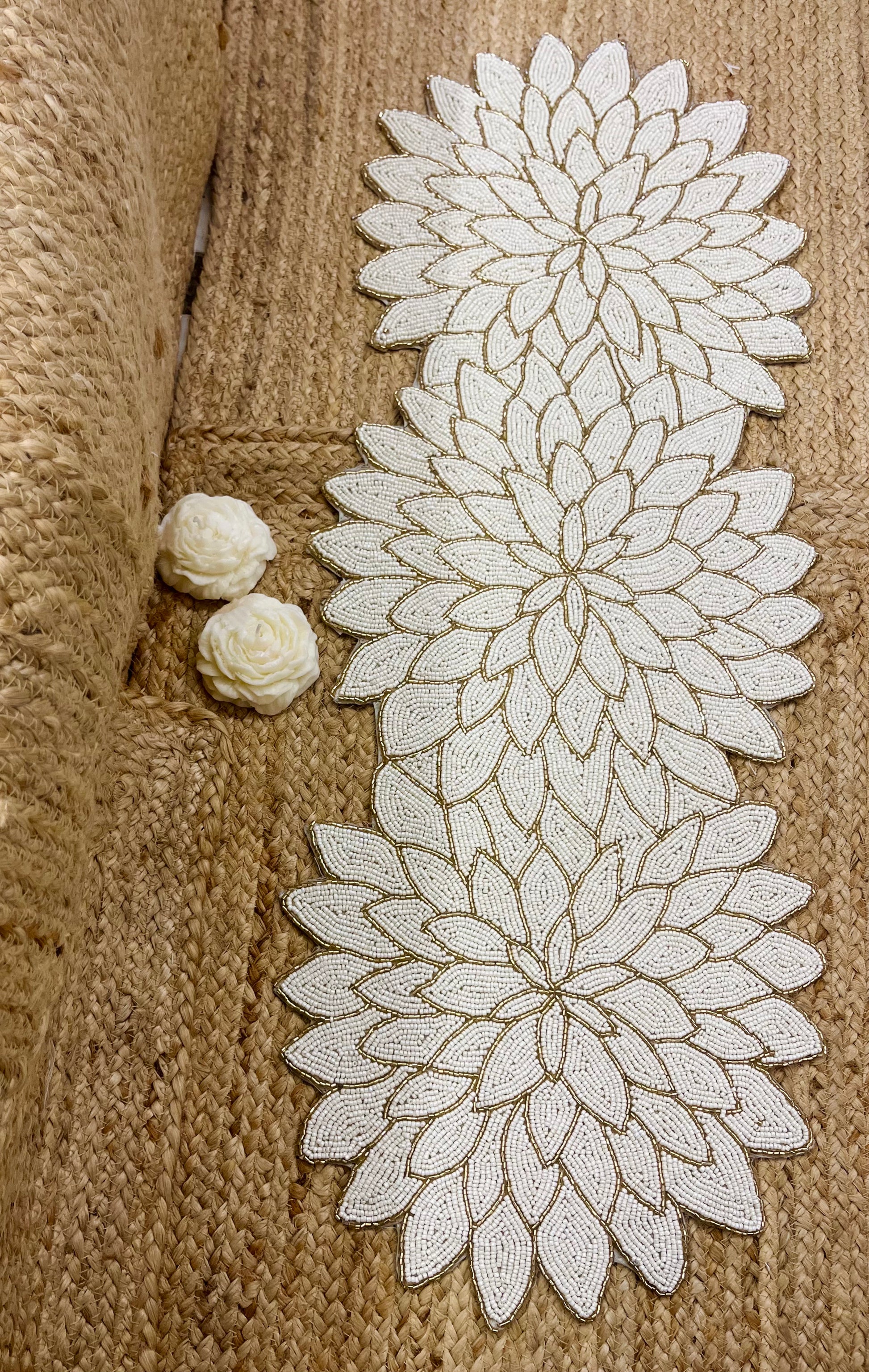 Elevate your aesthetic with glass beaded White Floral Design Table Runner with a touch of modern and sophistication. It showcases handcrafted work to the finest.