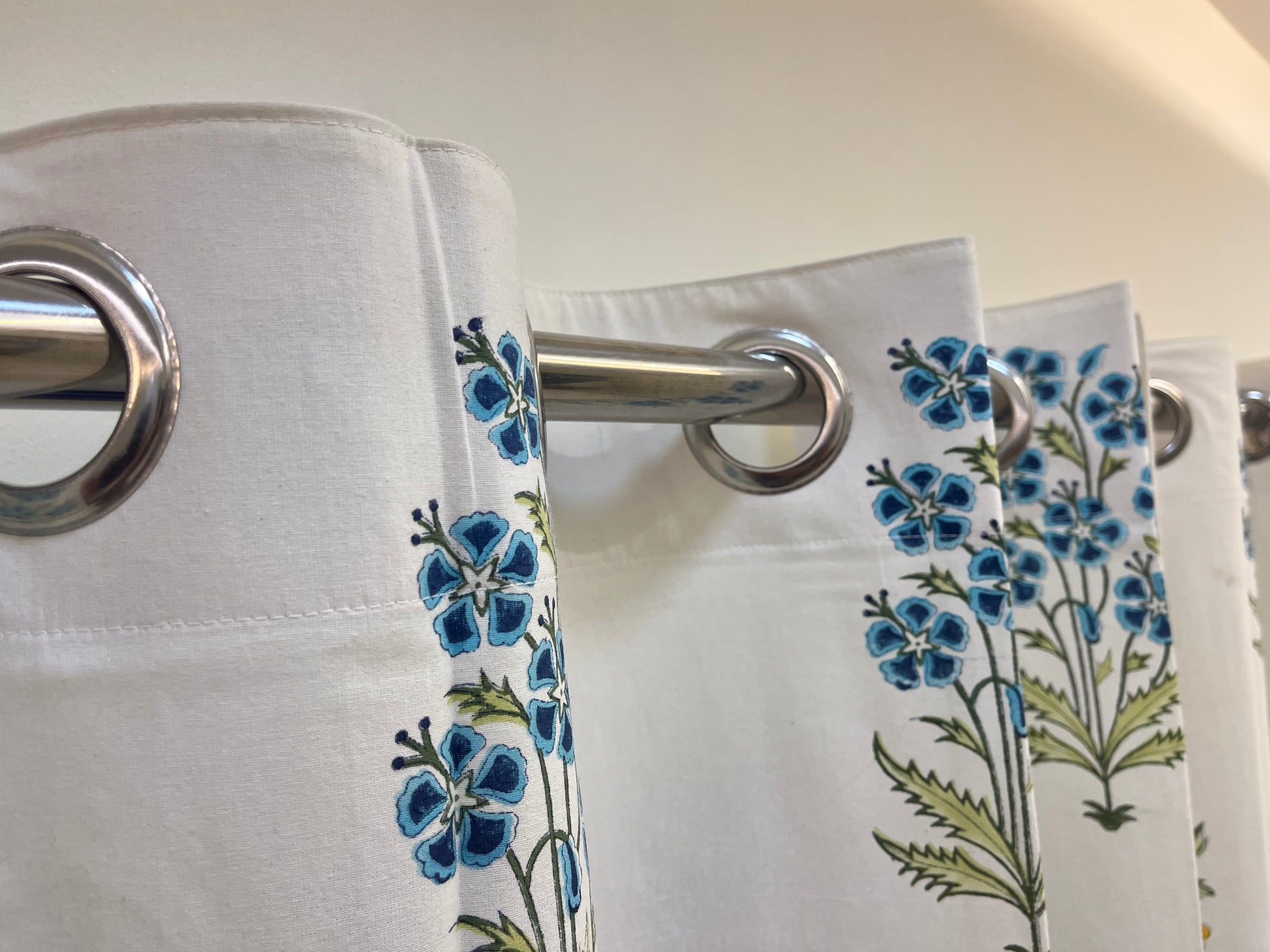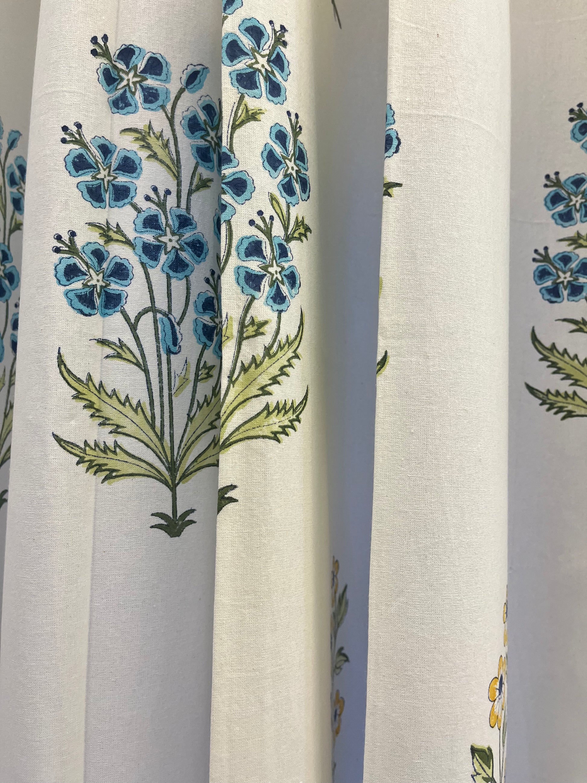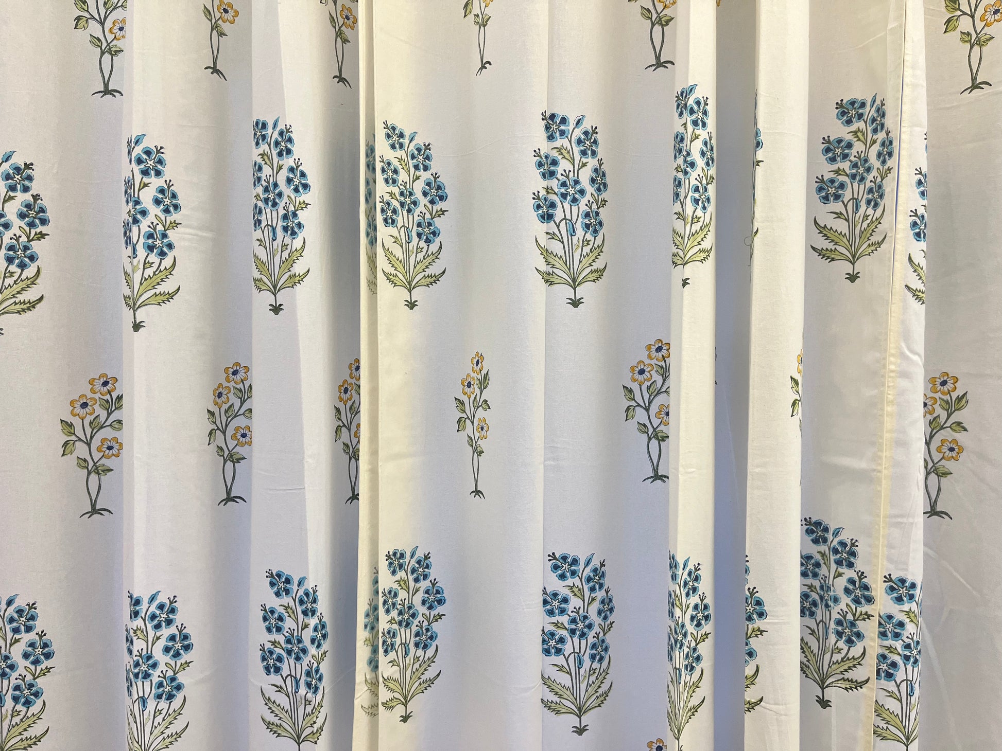 White Handblock Curtain with Blue and Green floral pattern 2