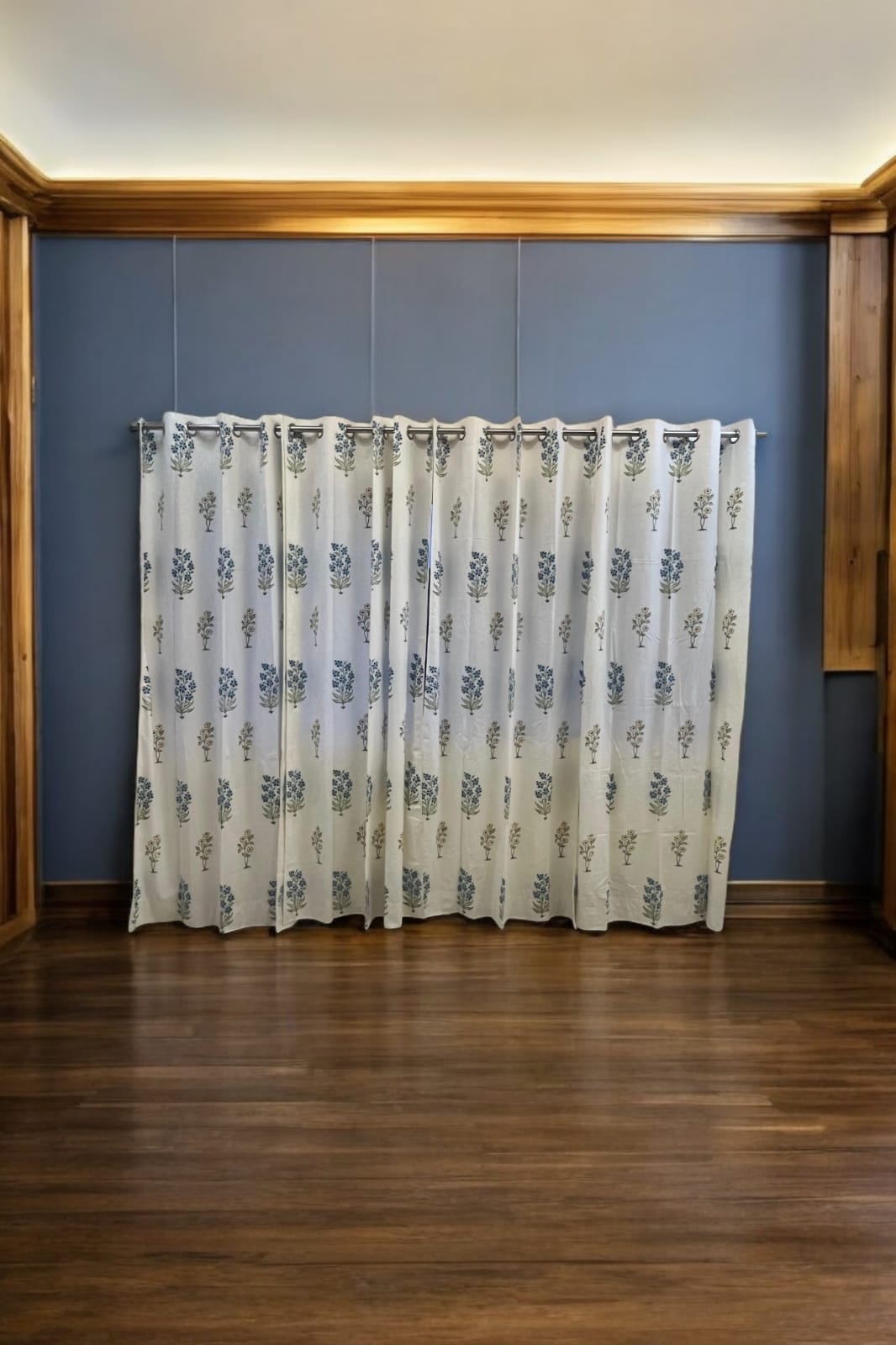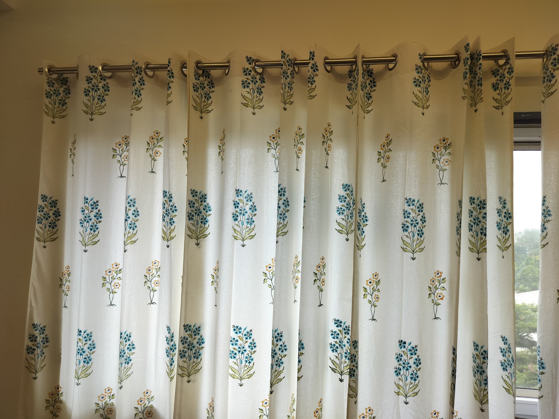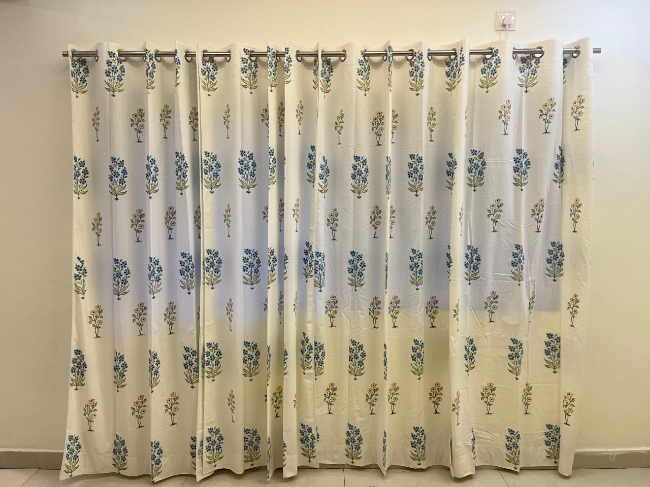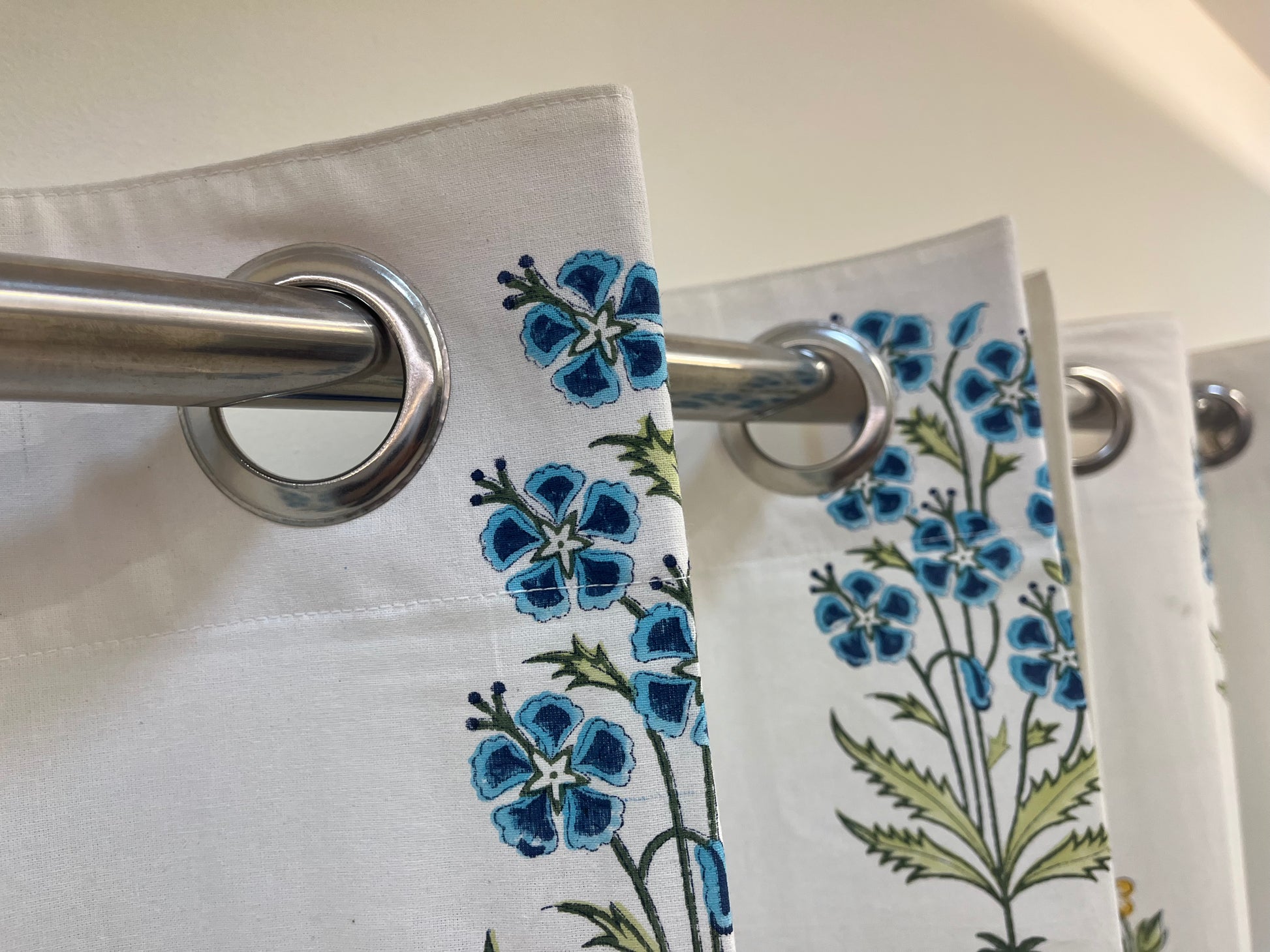White Handblock Curtain with Blue and Green floral pattern 2