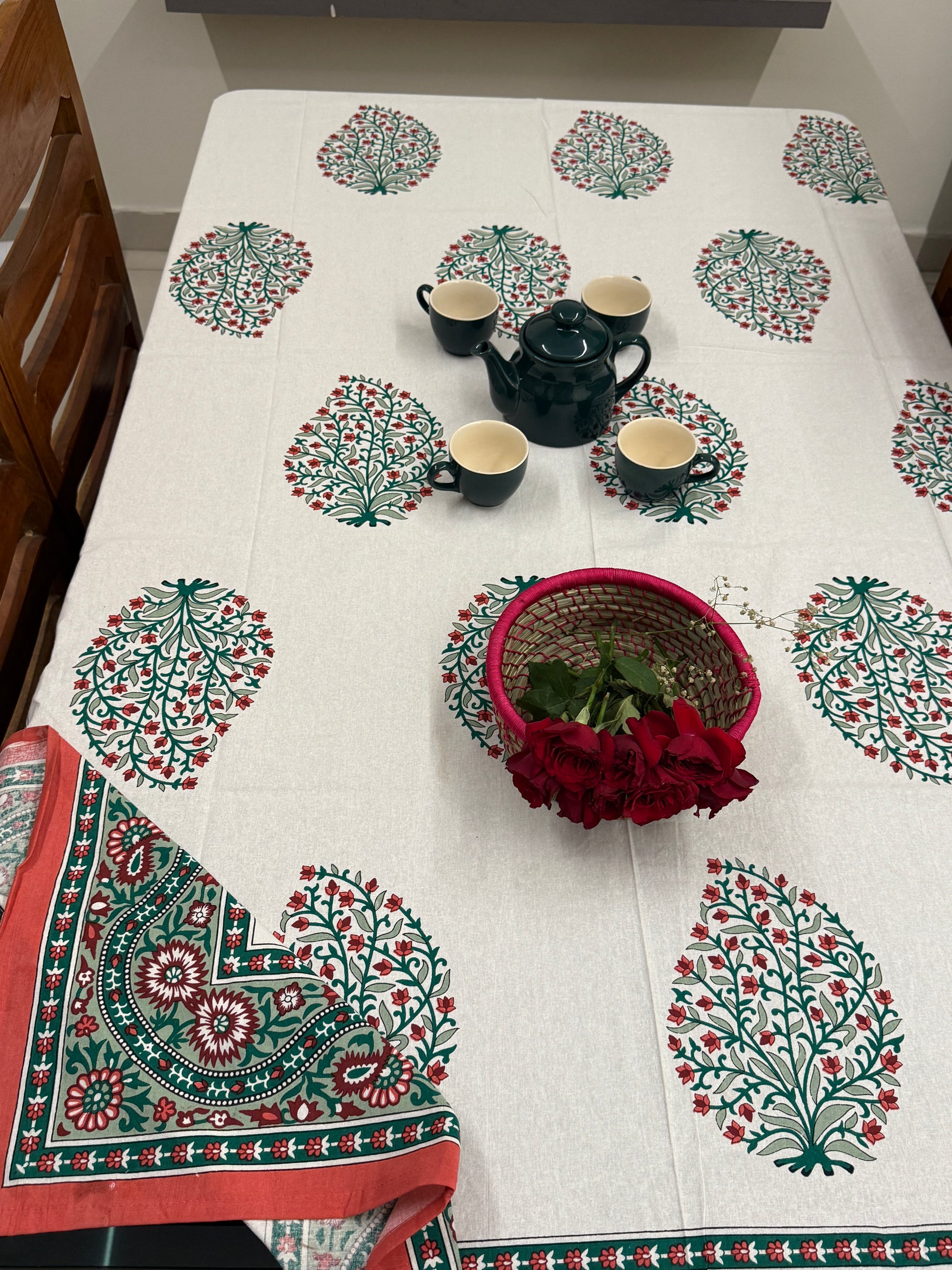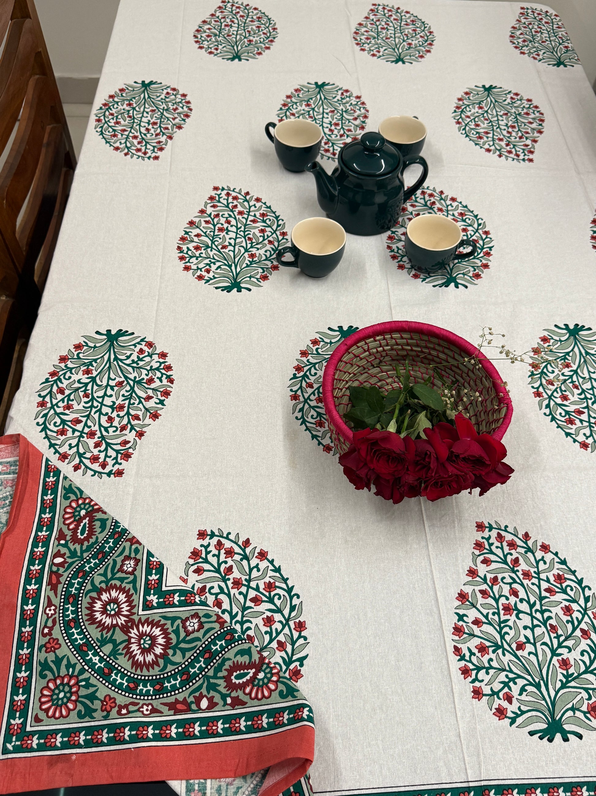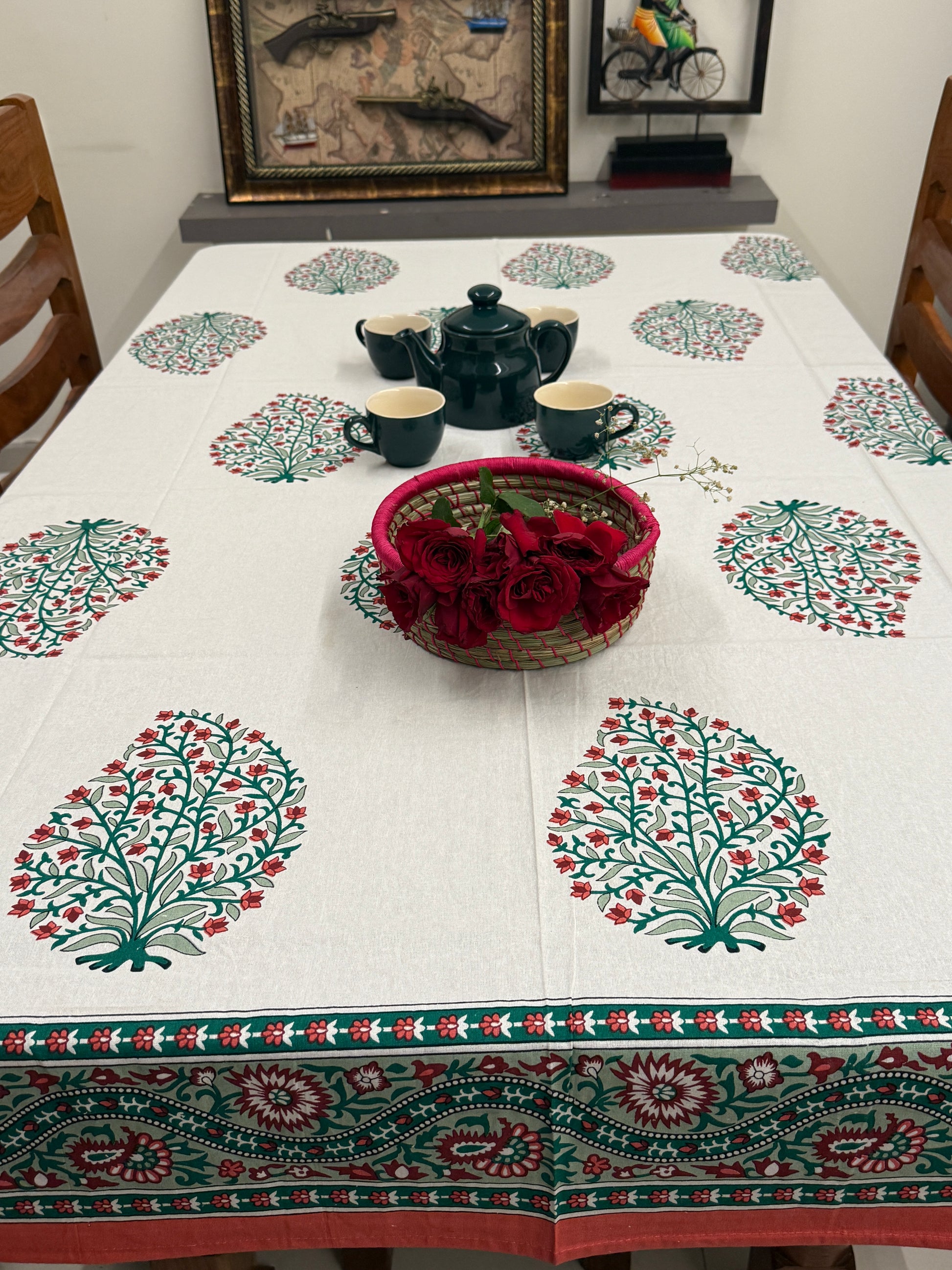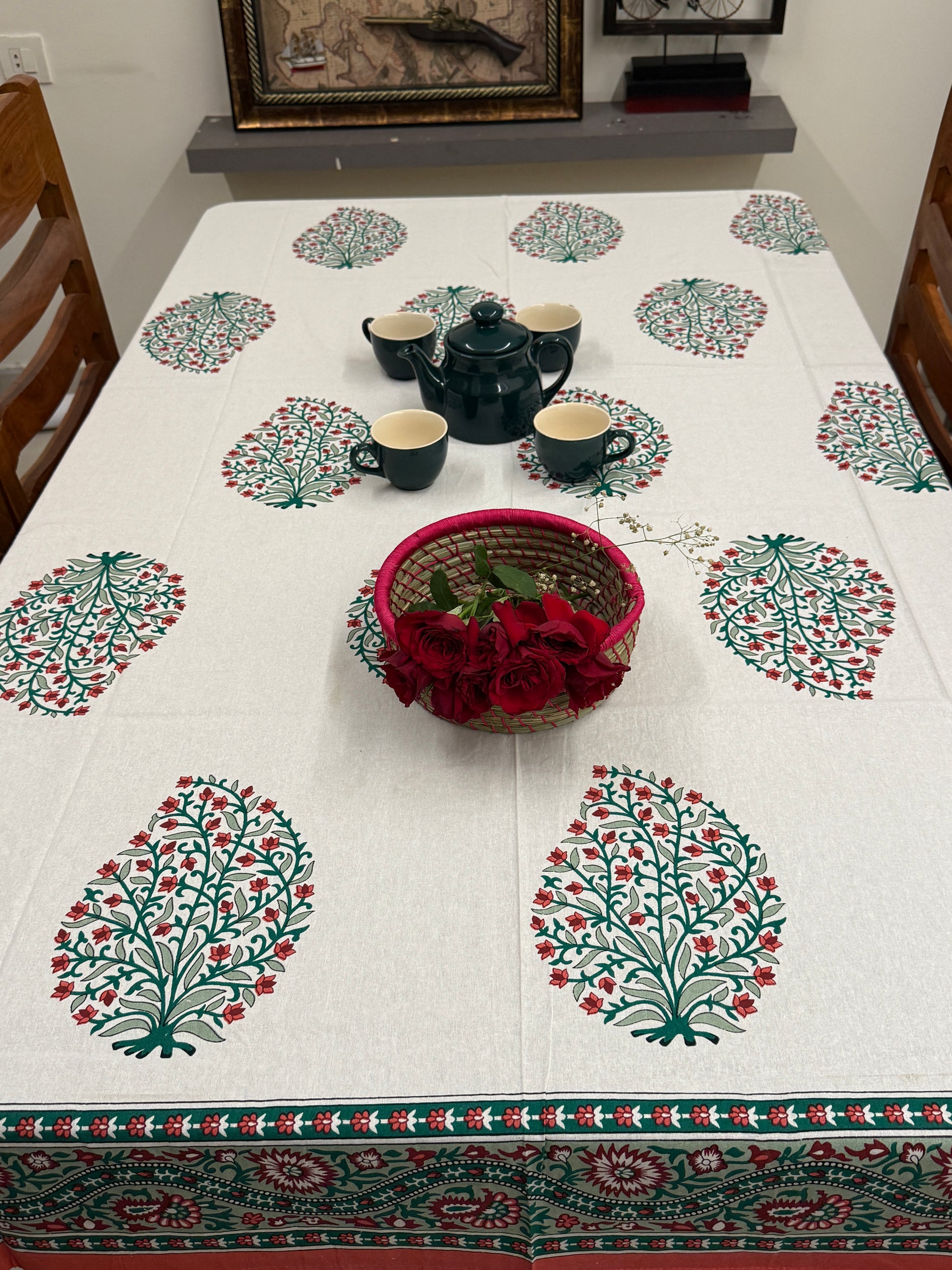 Transform your dining area with the Floral White Red Handblock Table Cover, a perfect combination of style and functionality. Handcrafted using traditional handblock printing techniques, this tablecloth is designed to add elegance to your 6-seater rectangular dining table. Made from 100% cotton, it ensures durability, comfort, and easy maintenance.