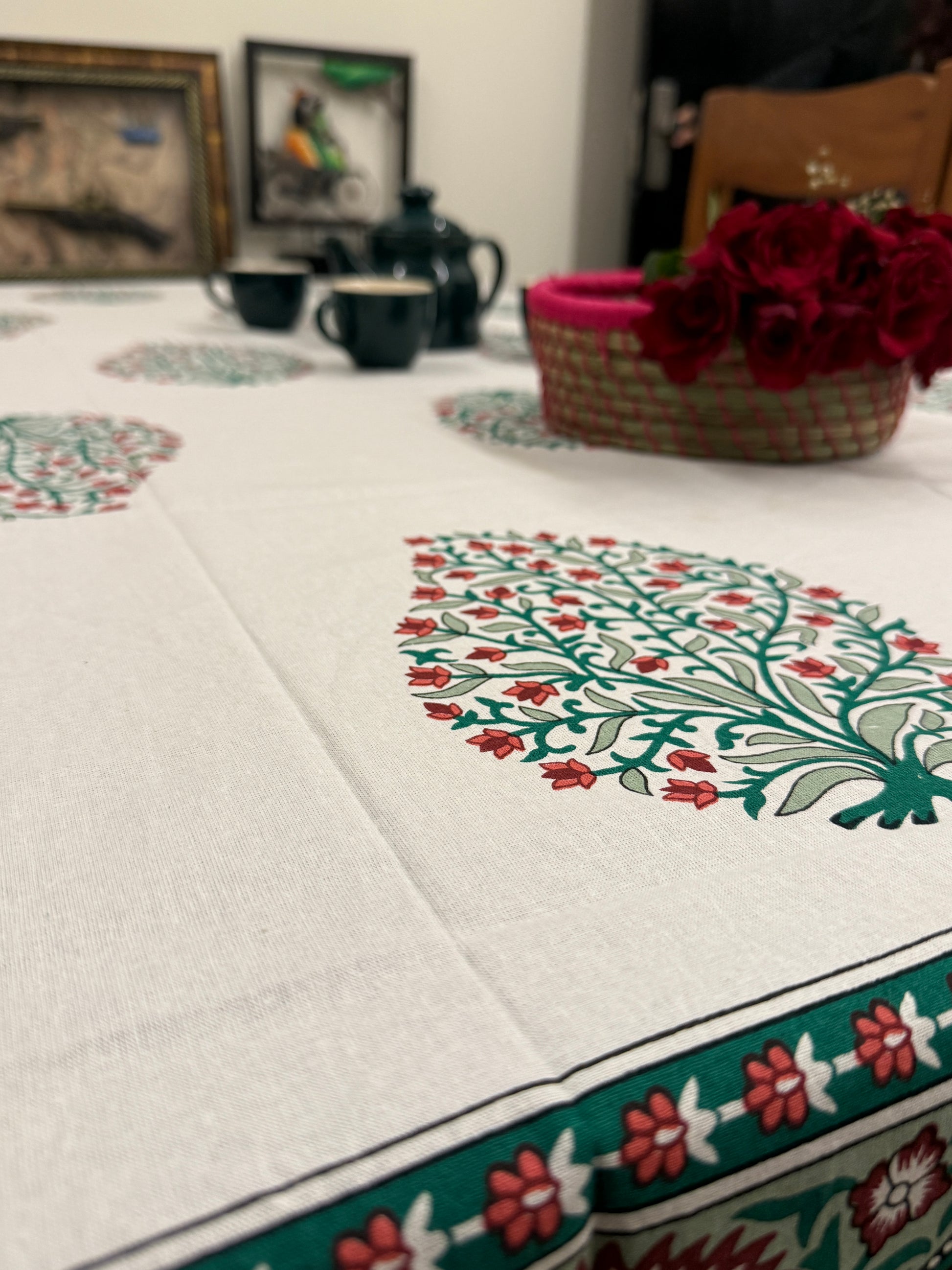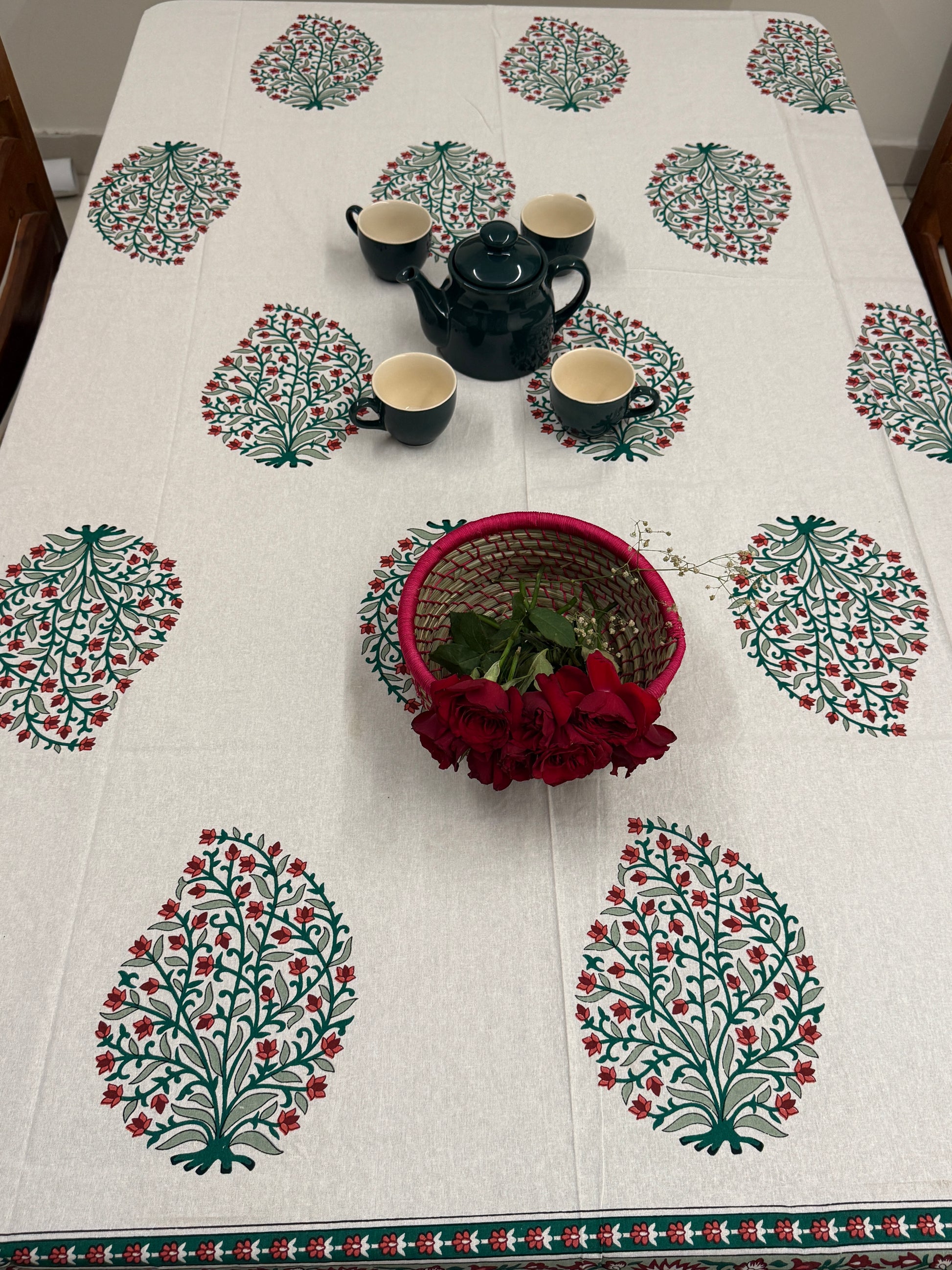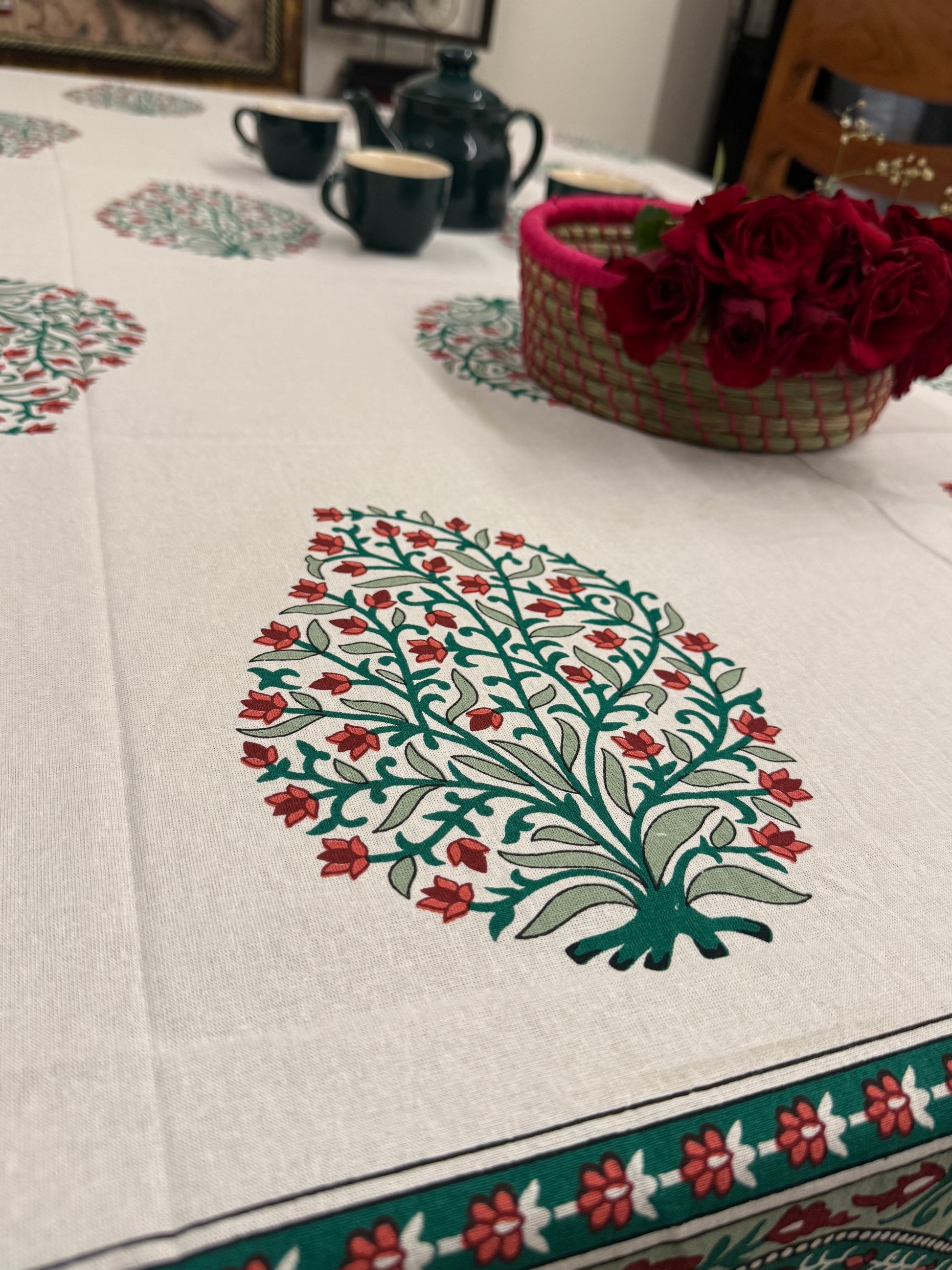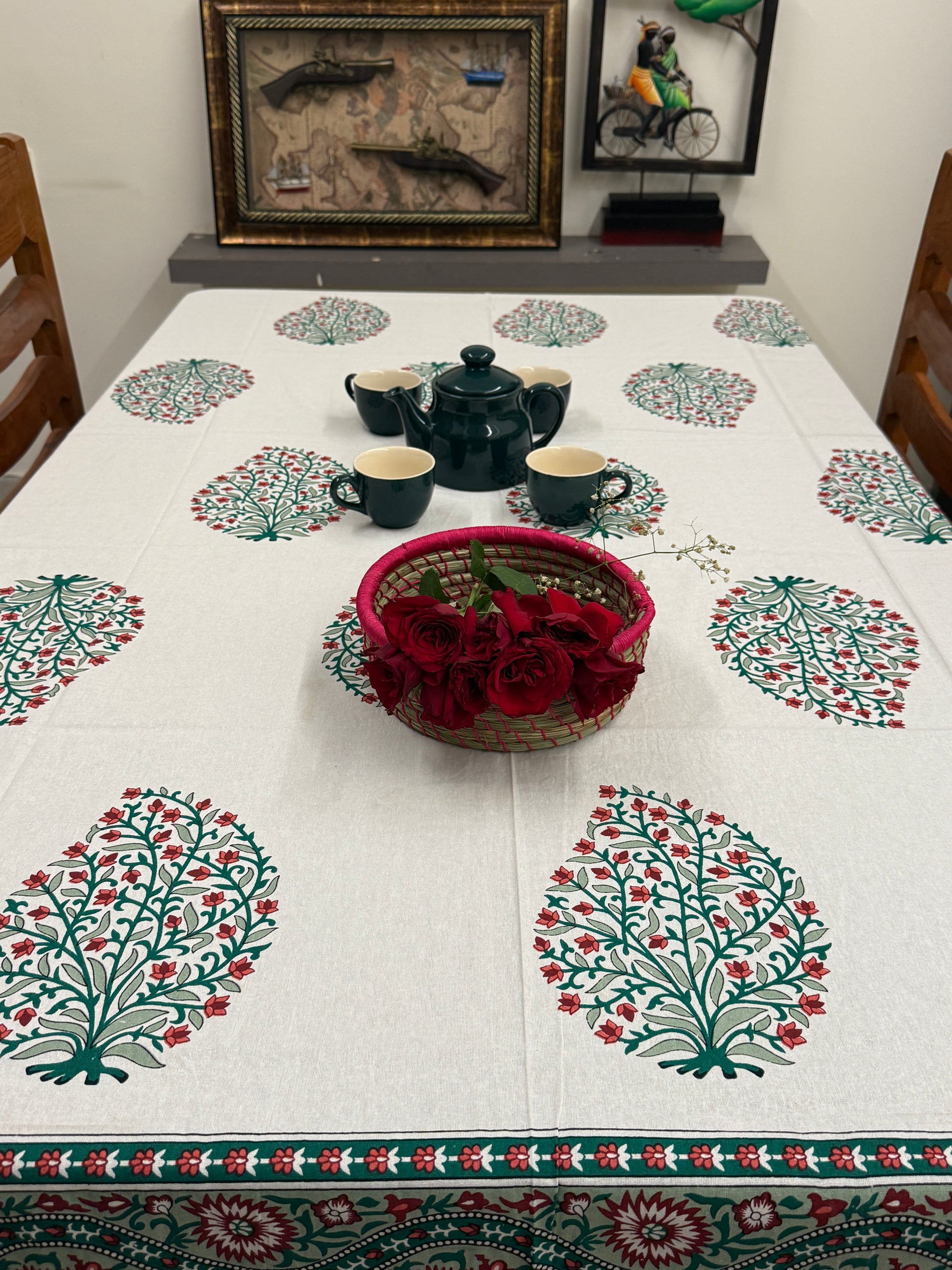 Transform your dining area with the Floral White Red Handblock Table Cover, a perfect combination of style and functionality. Handcrafted using traditional handblock printing techniques, this tablecloth is designed to add elegance to your 6-seater rectangular dining table. Made from 100% cotton, it ensures durability, comfort, and easy maintenance.