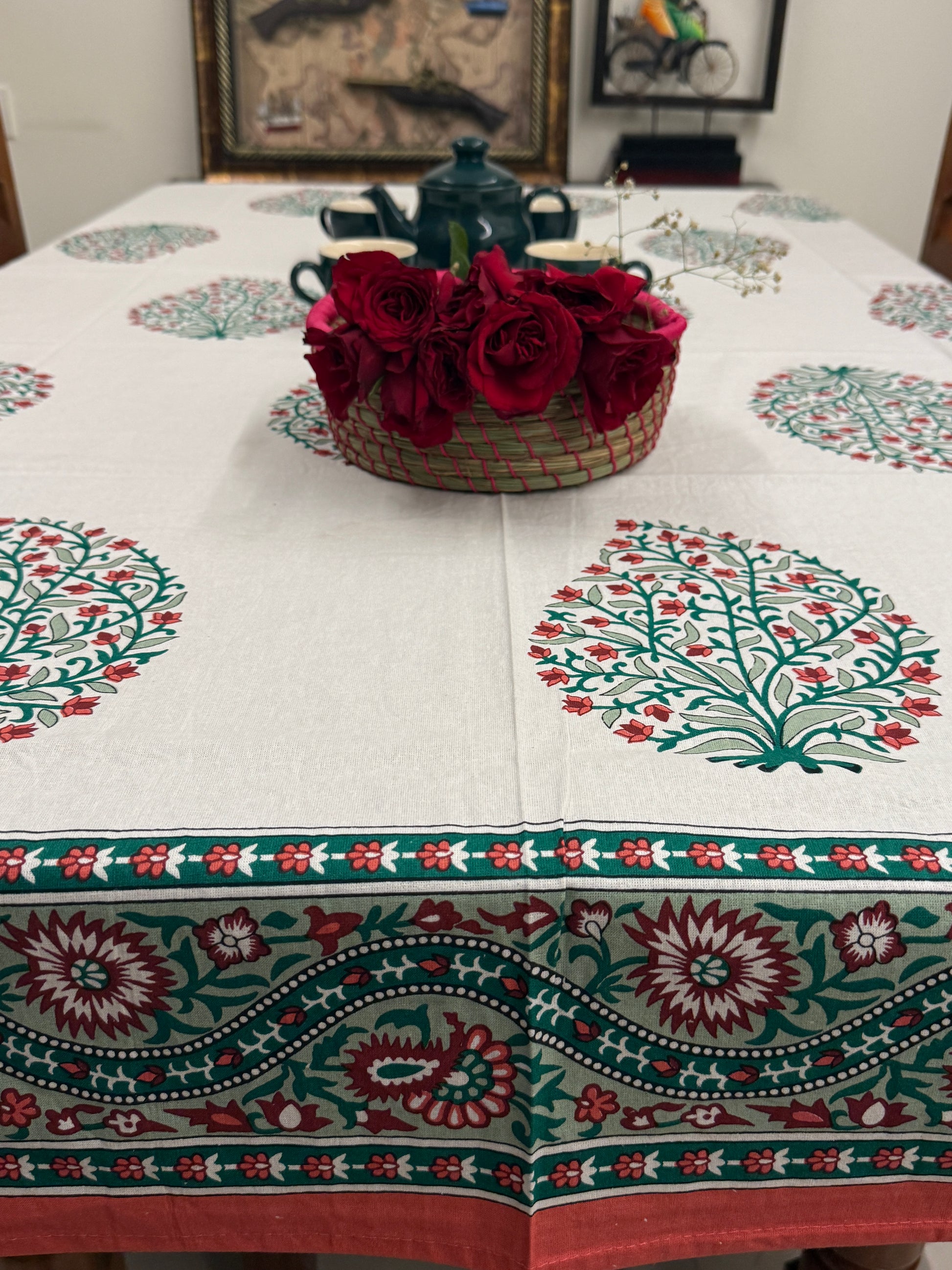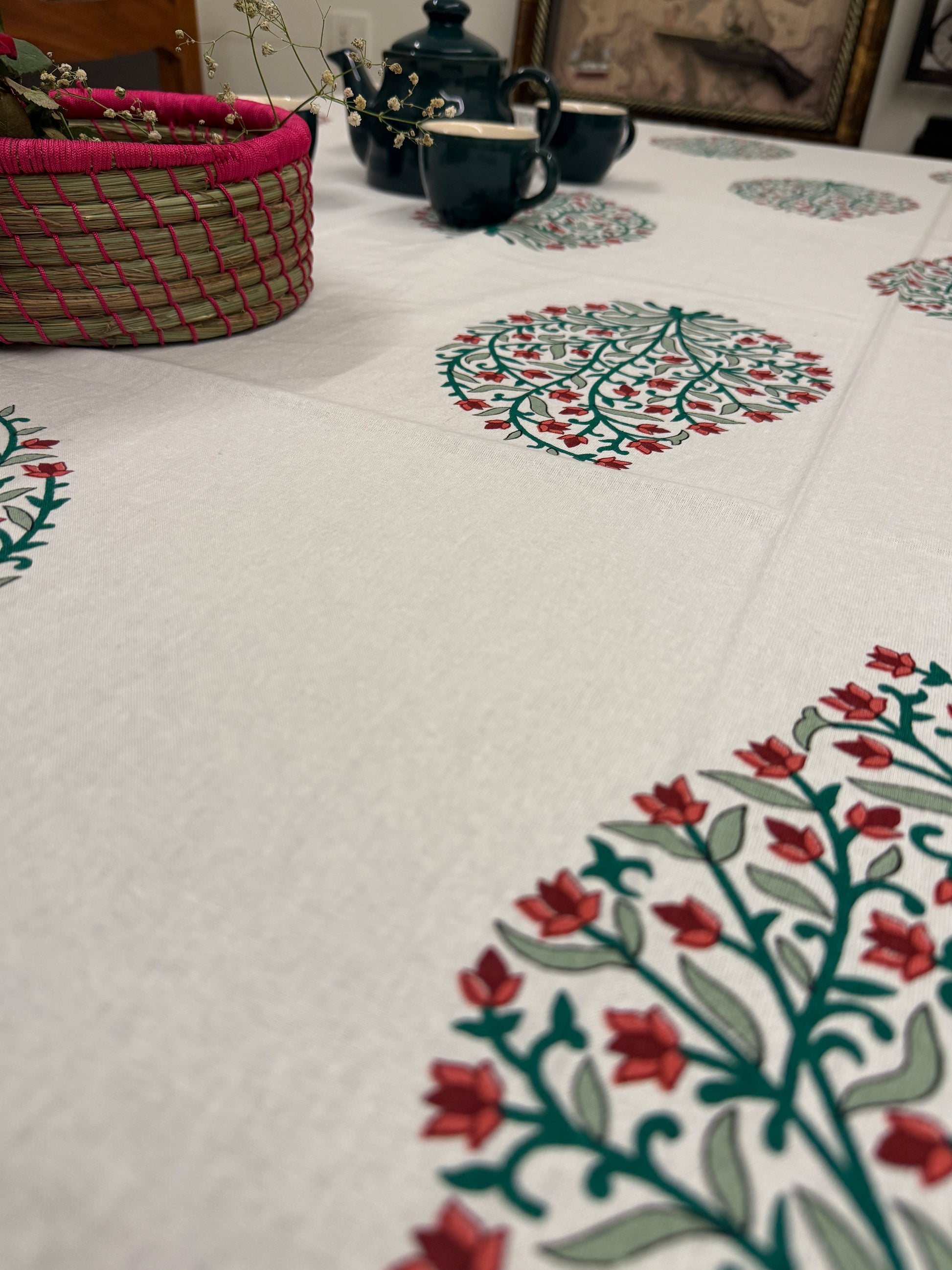 Floral White Red Cotton Handblock Table Cover – 60x90 Inches for 6-Seater Dining Tables