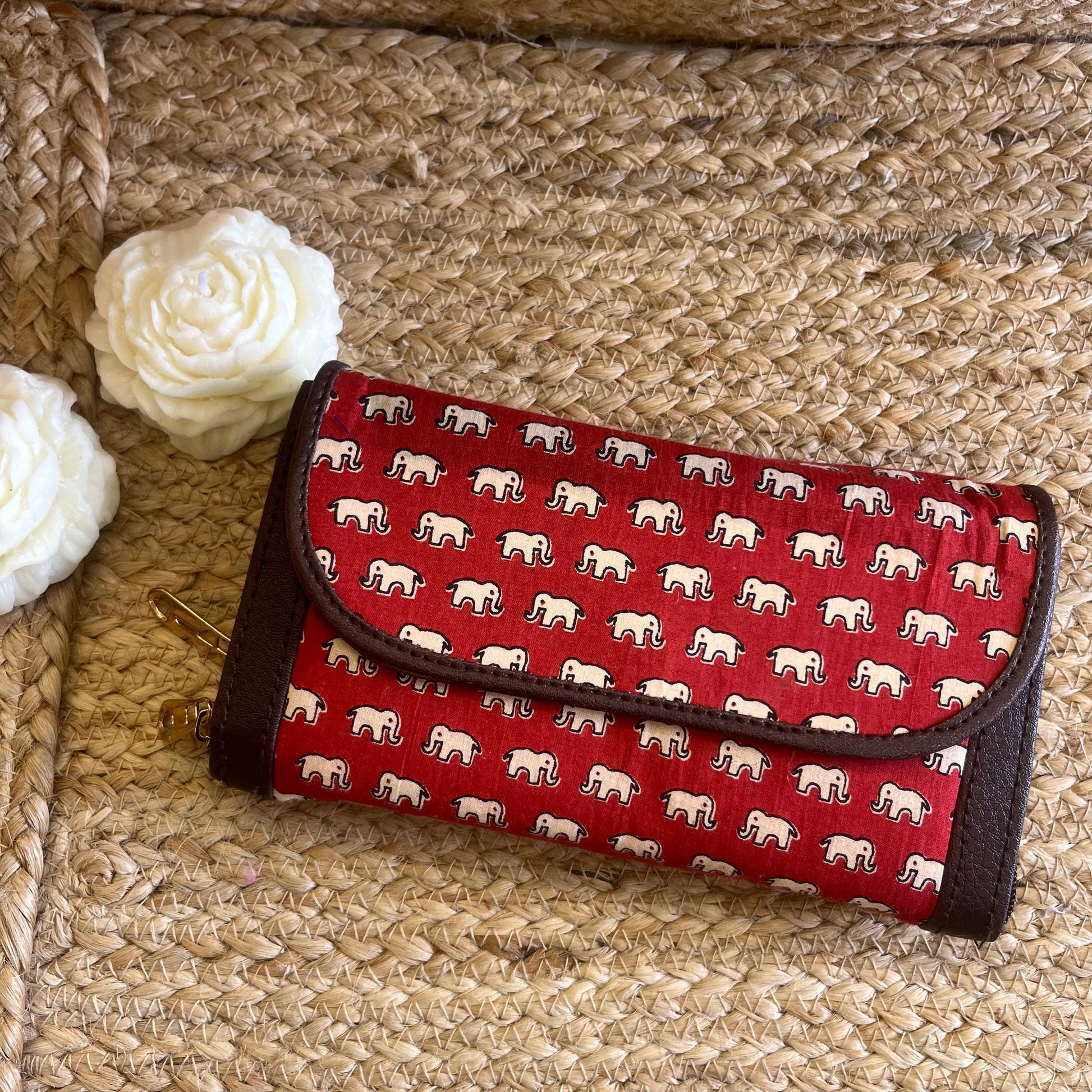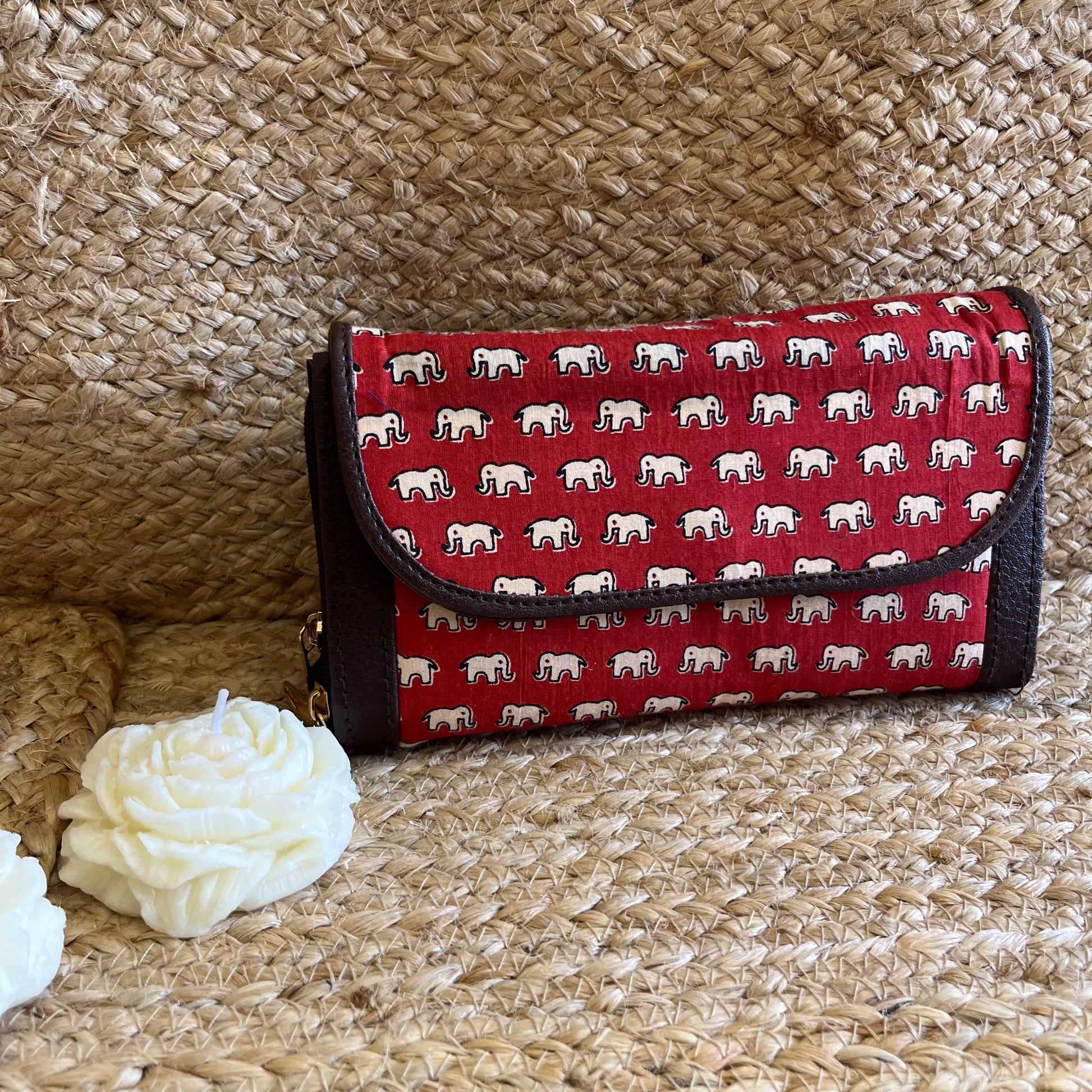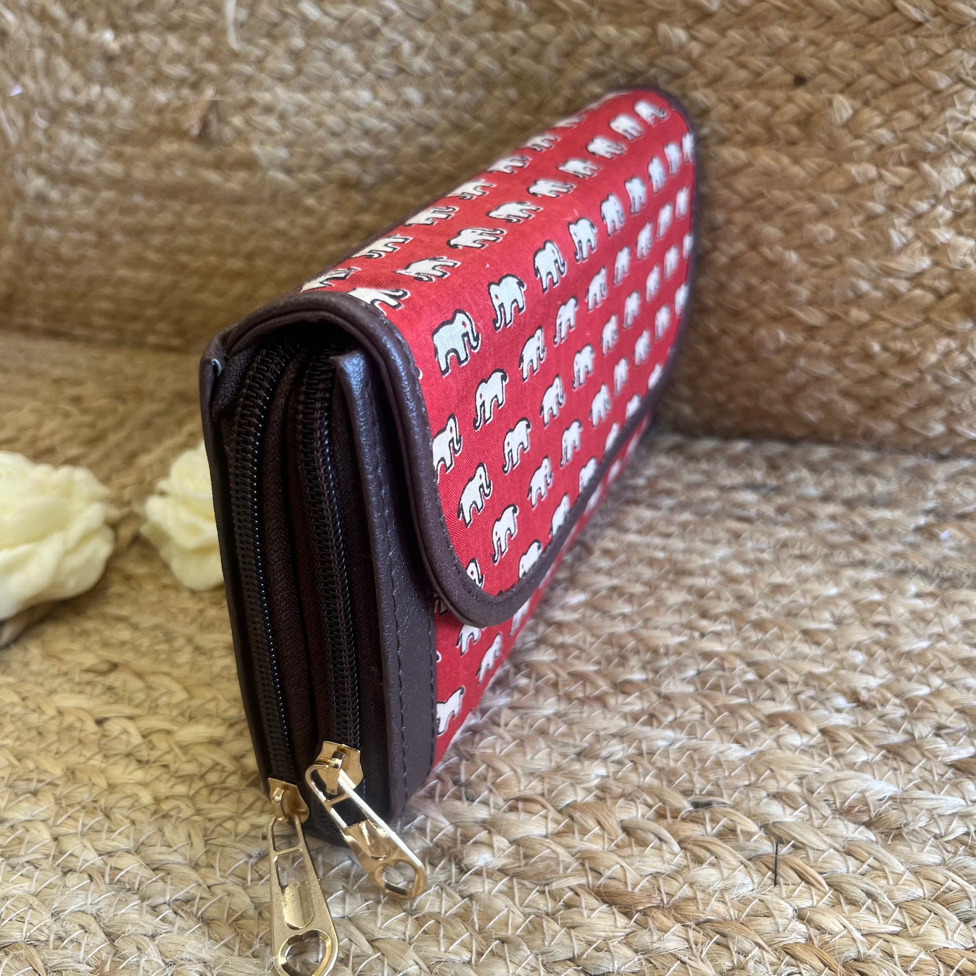 Women Red Elephant Ethnic Handblock Printed Zip Around Vegan Leather Wallet