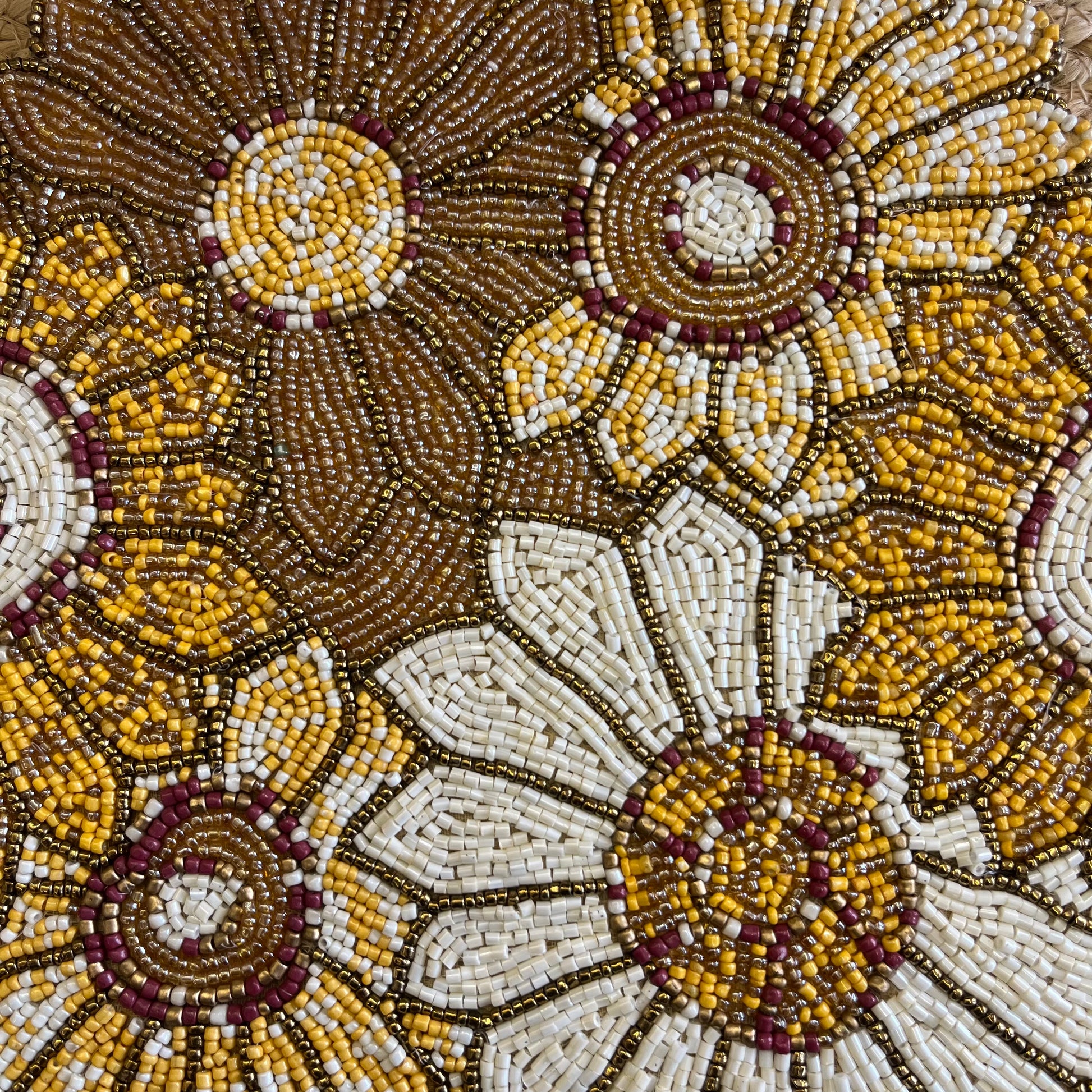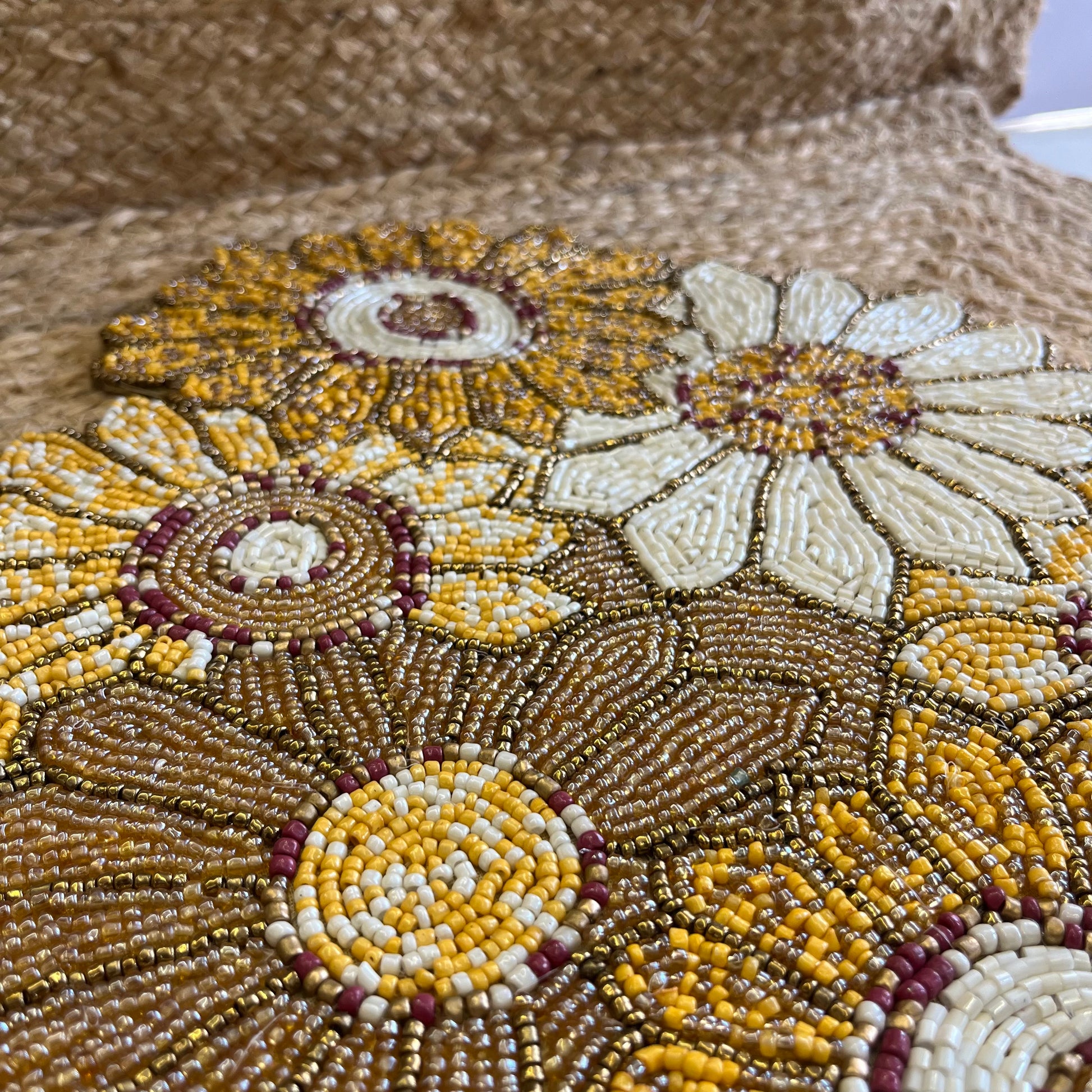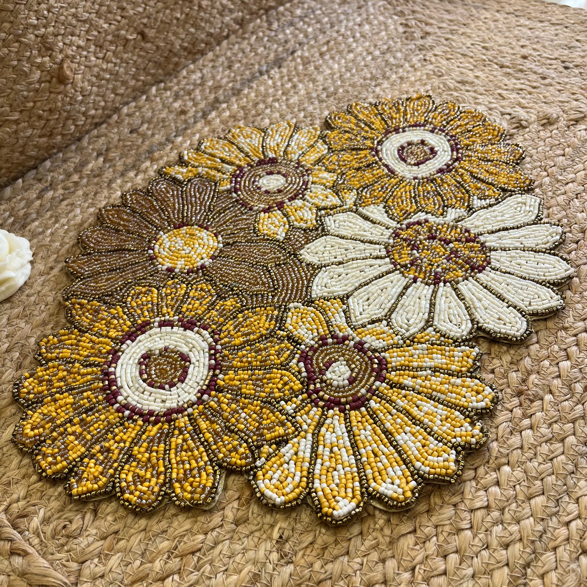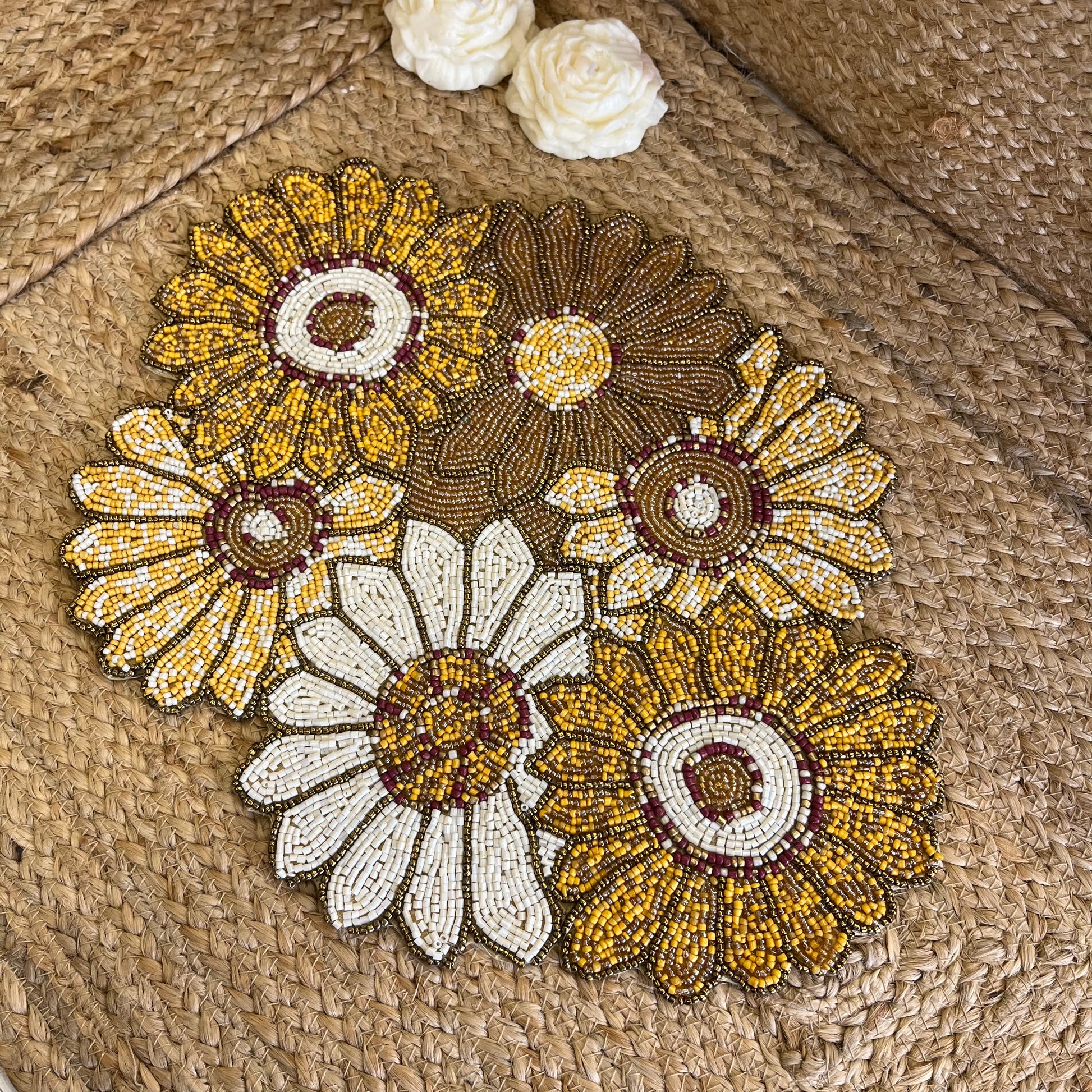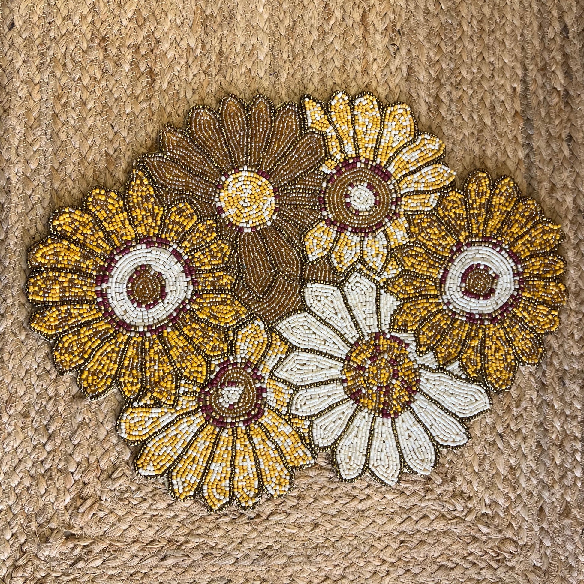 Elevate your center table, living room, and dinning space with this beautiful Yellow Abstract Floral Table Placemat , featuring beautiful glass beaded yellow abstract floral design, handmade by the artisans. Taking your decor to the next level.