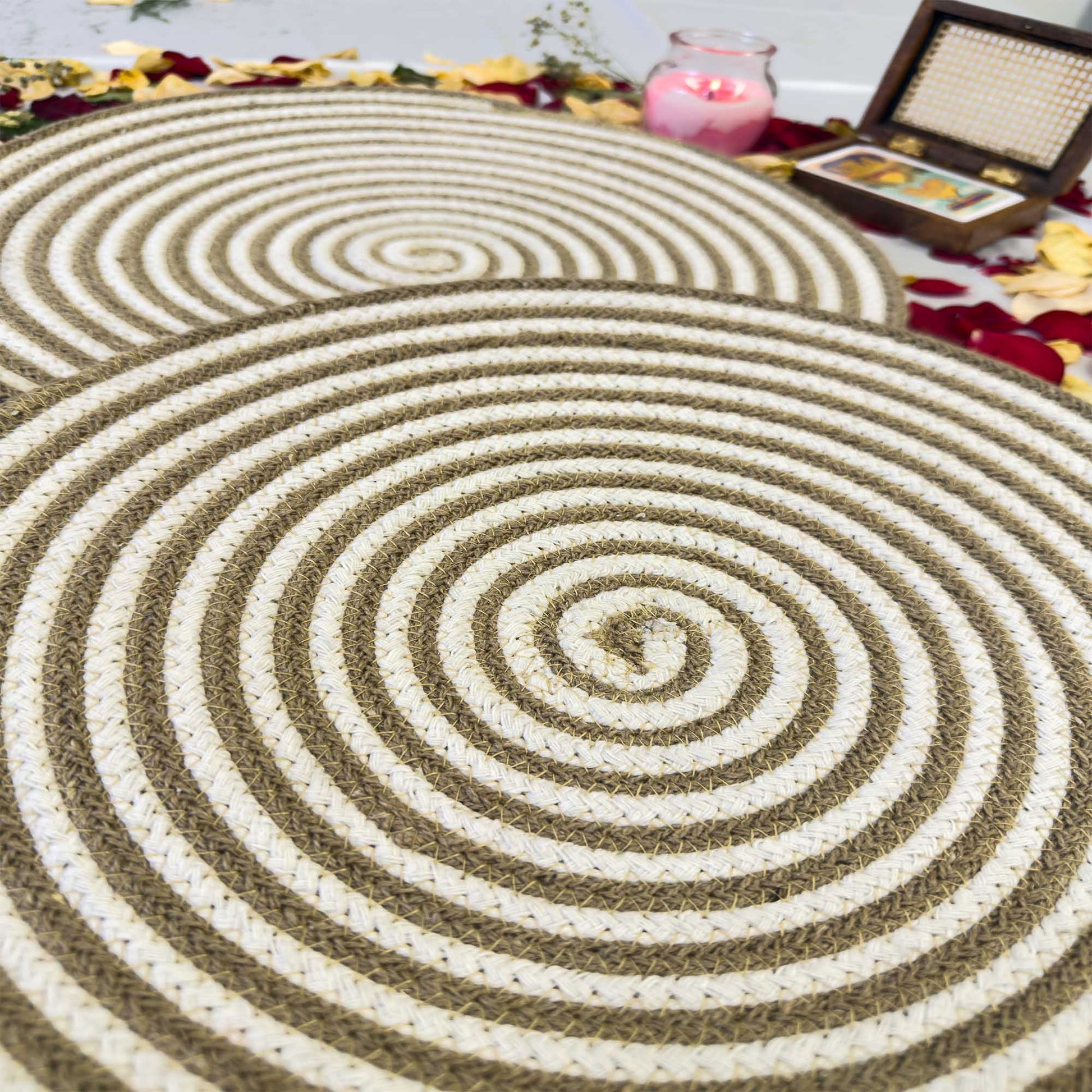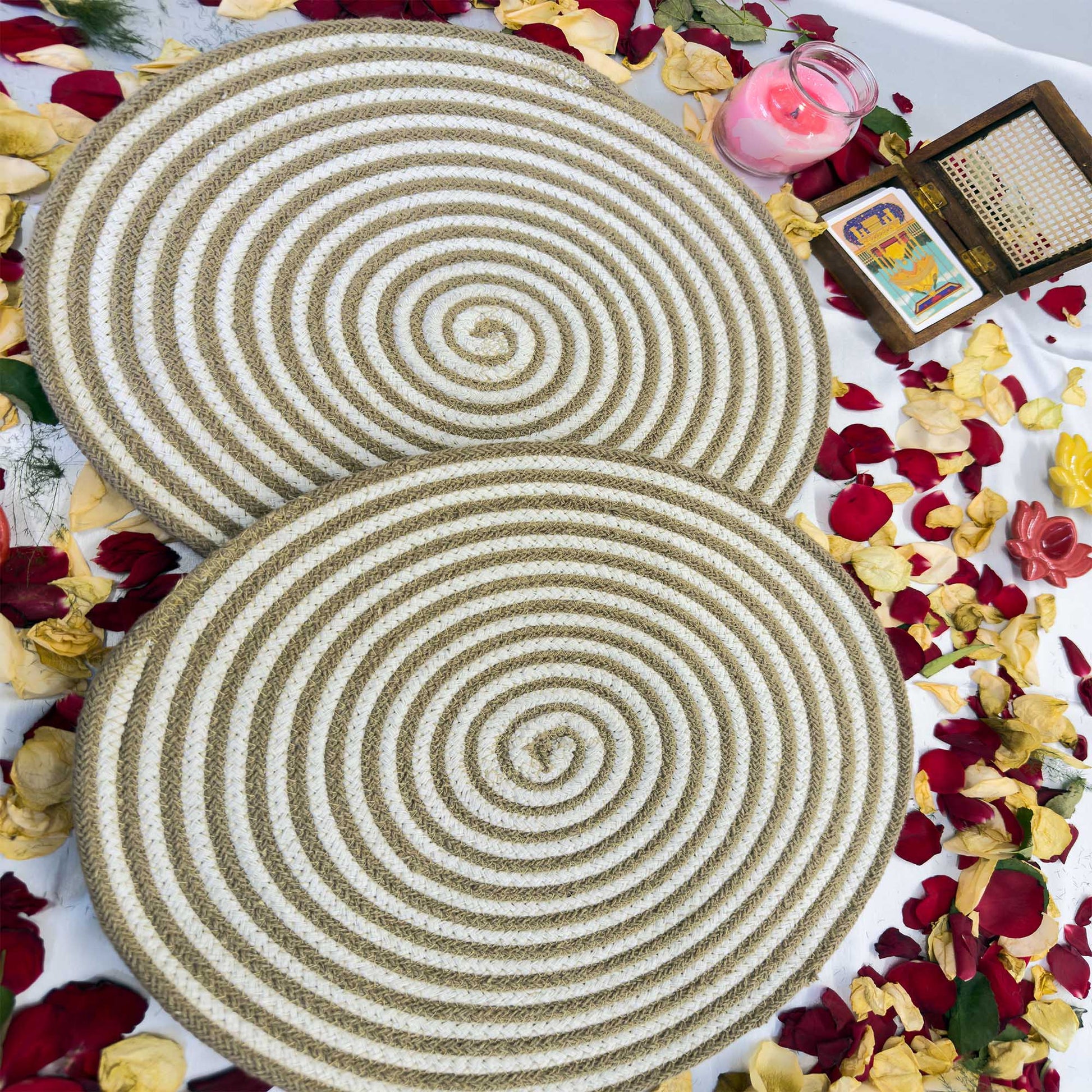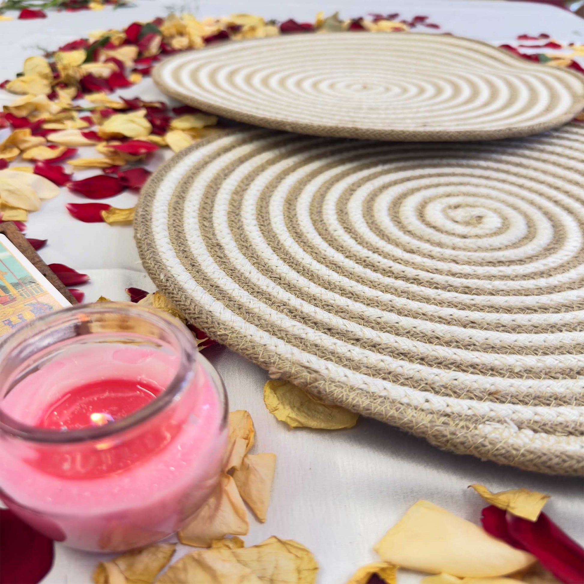 Enhance your dining experience with the White Spiral Table Placemat (Pack of 2) . These eco-friendly placemats are handcrafted from high-quality jute, making them a sustainable and stylish addition to your home. With a natural braided design and a 14-inch diameter, they are perfect for dining tables, bedside tables, center tables, or shelves.