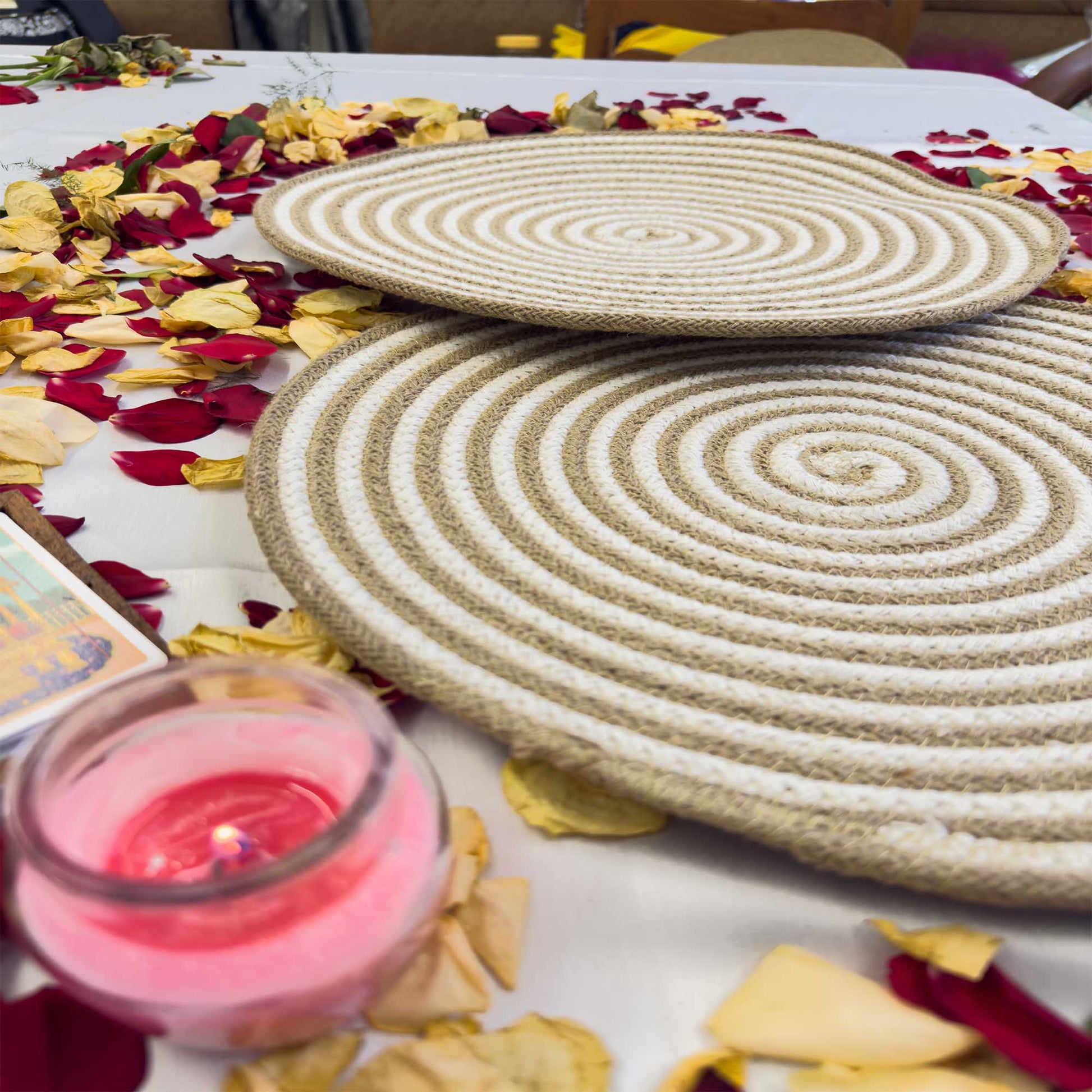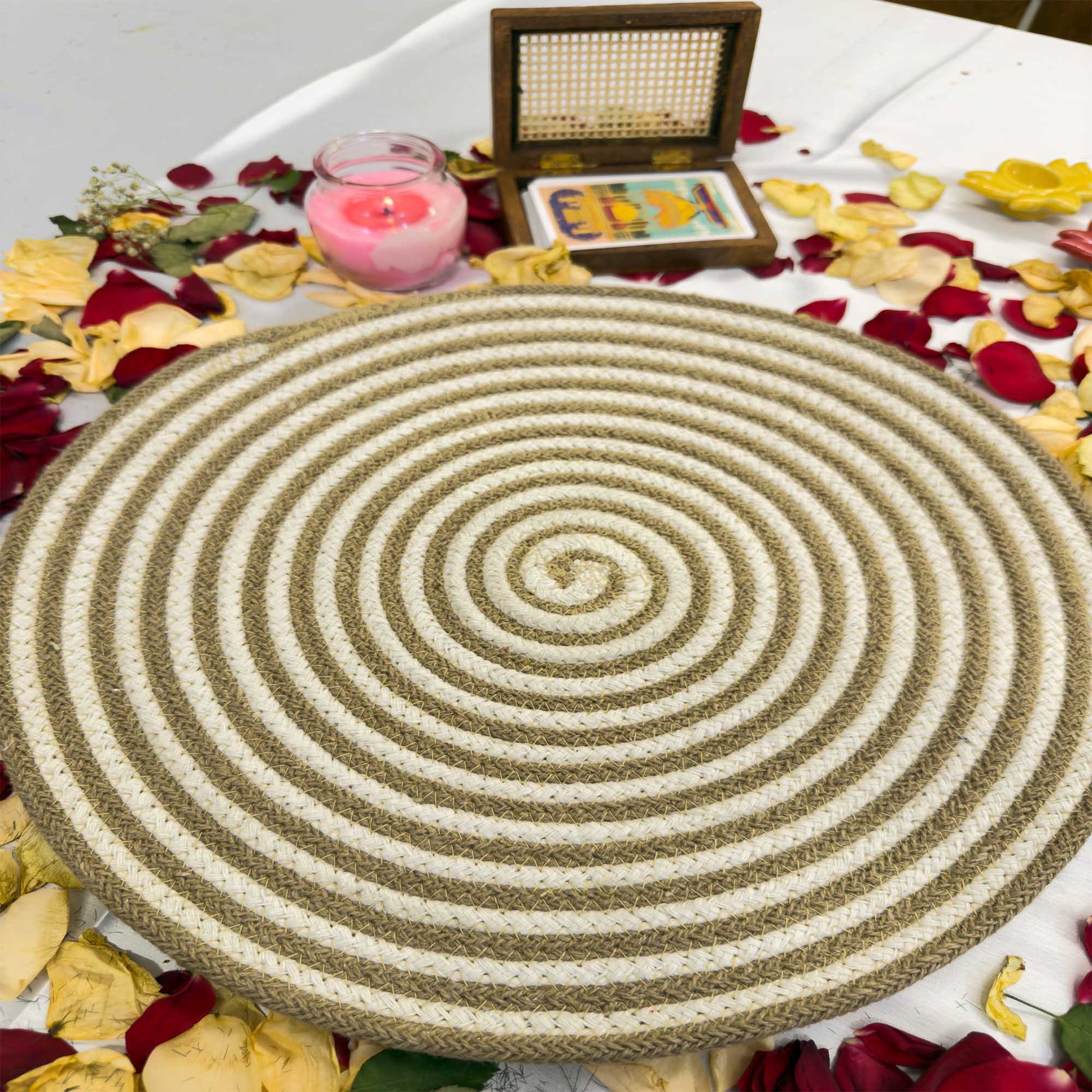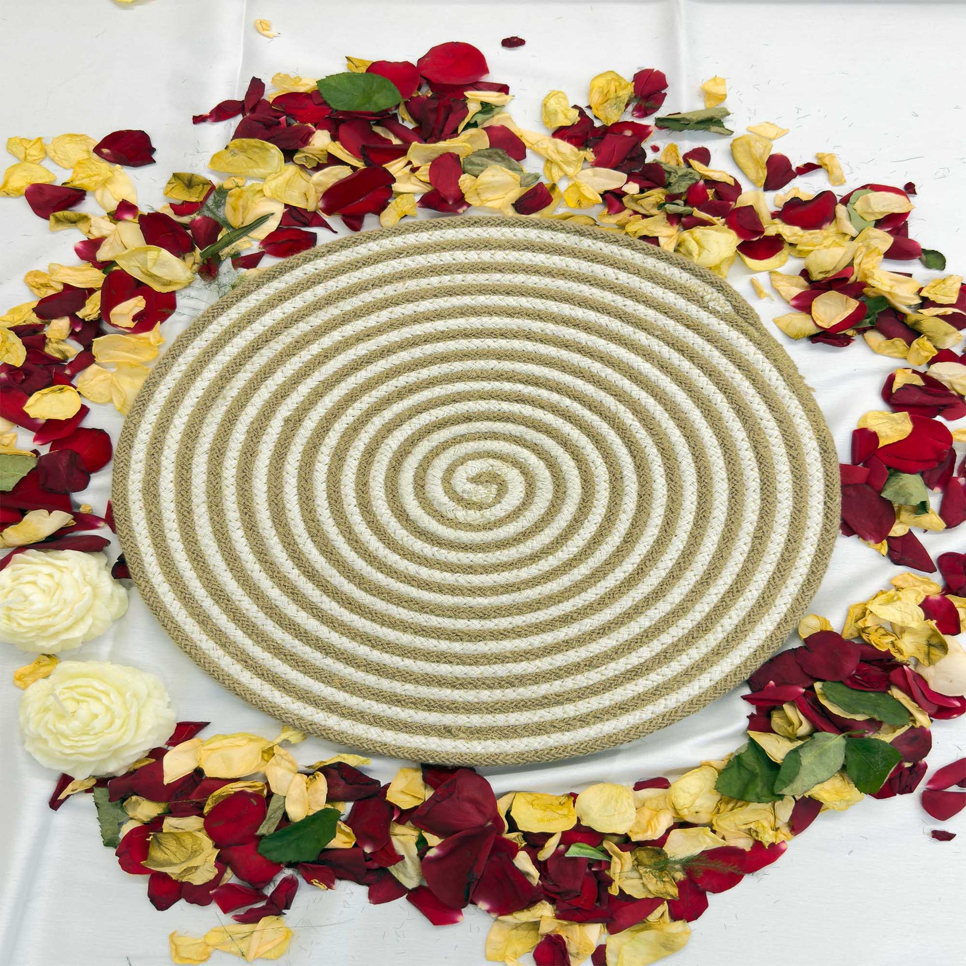 Enhance your dining experience with the White Spiral Table Placemat (Pack of 2) . These eco-friendly placemats are handcrafted from high-quality jute, making them a sustainable and stylish addition to your home. With a natural braided design and a 14-inch diameter, they are perfect for dining tables, bedside tables, center tables, or shelves.