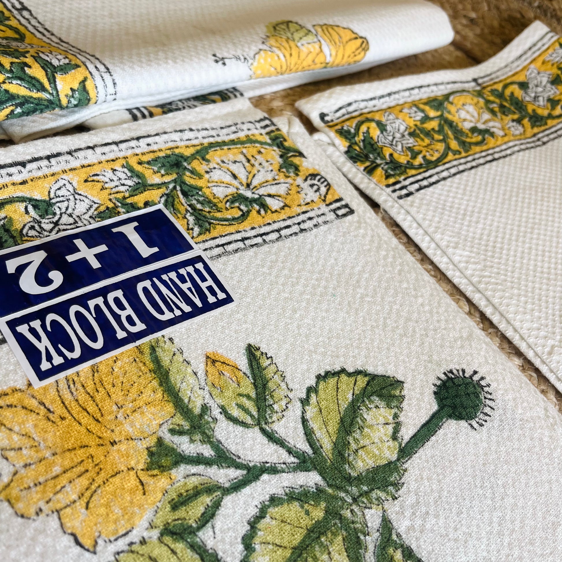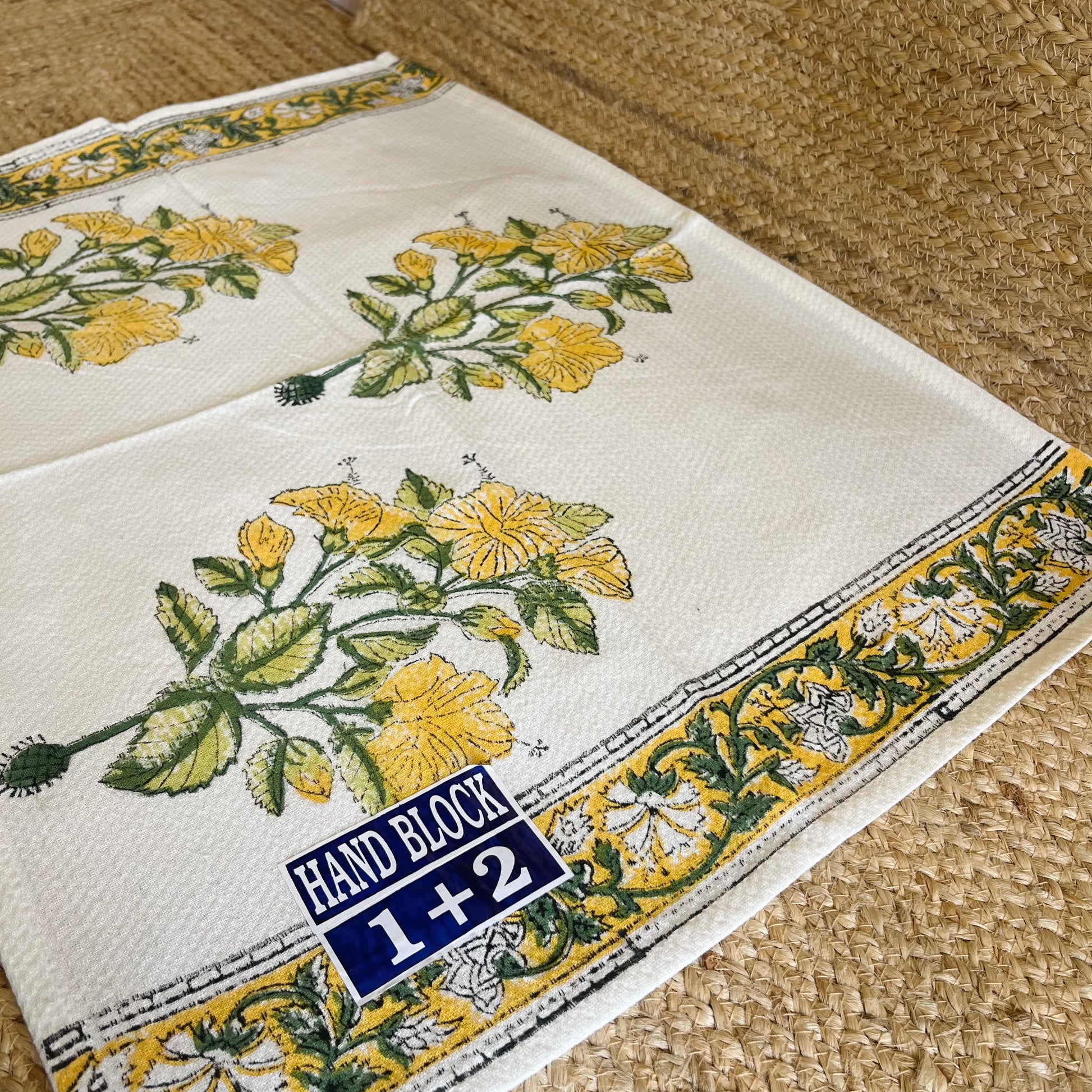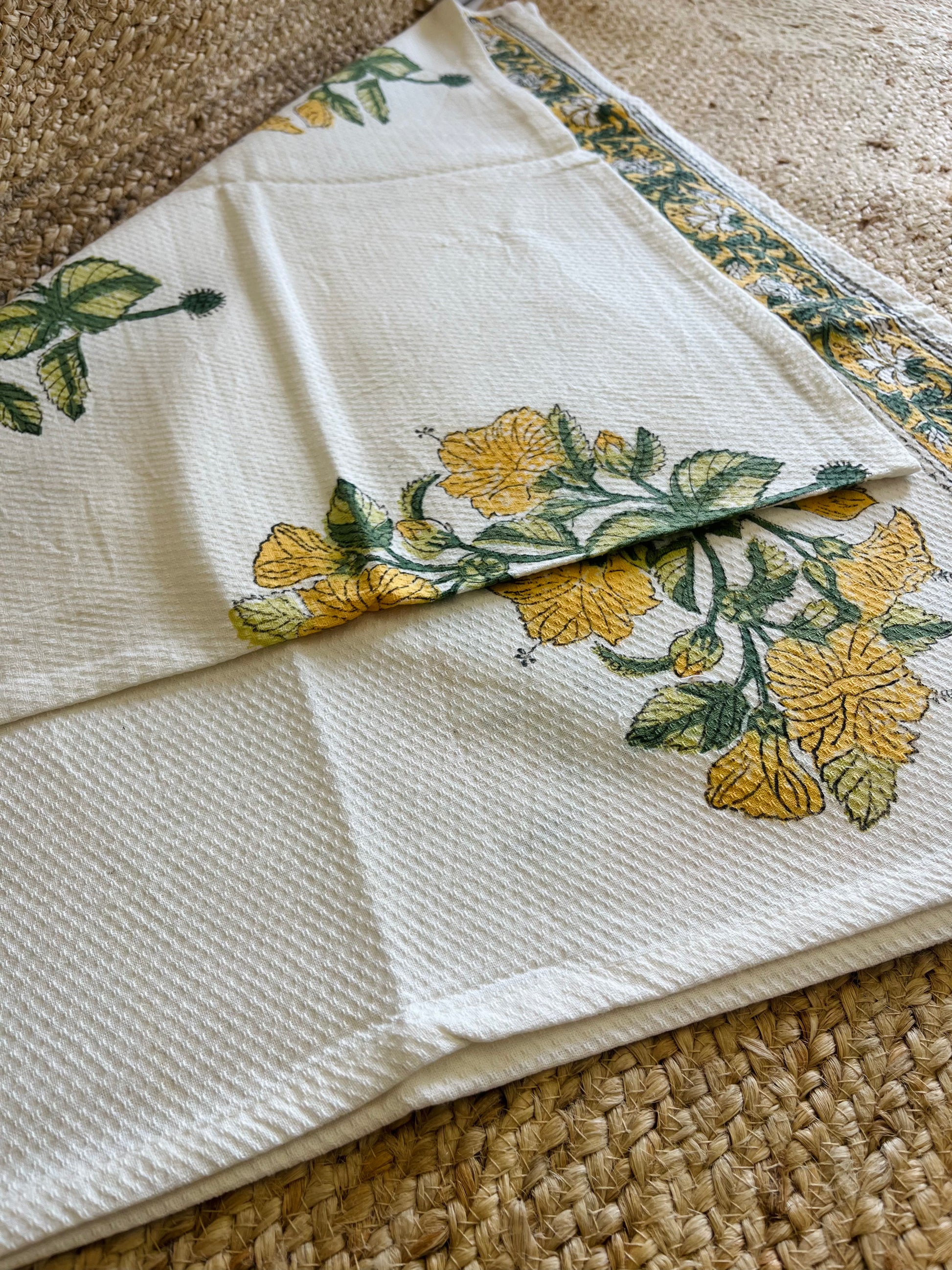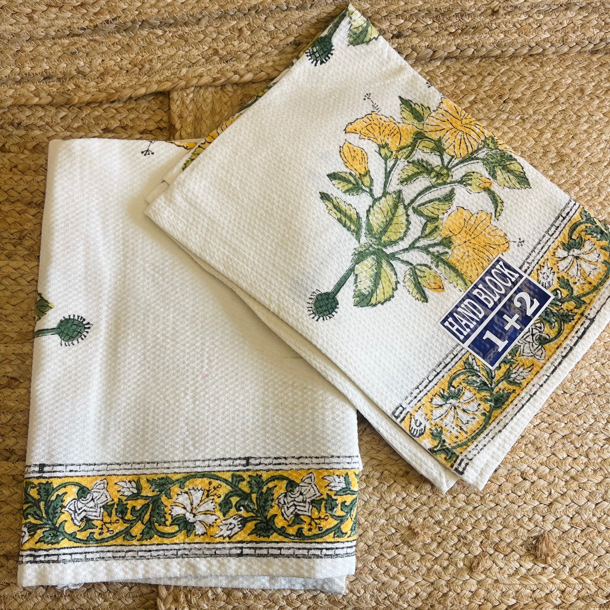 Yellow Floral Handblock Waffle Cotton Towel Set