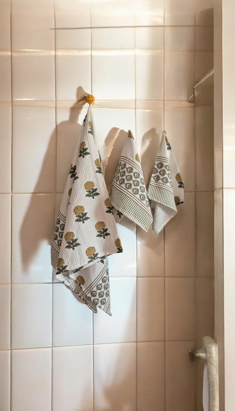 Yellow Floral White Handblock Towels Set of 3 – 1 Bath Towel, 2 Hand Towels, Soft Waffle Cotton