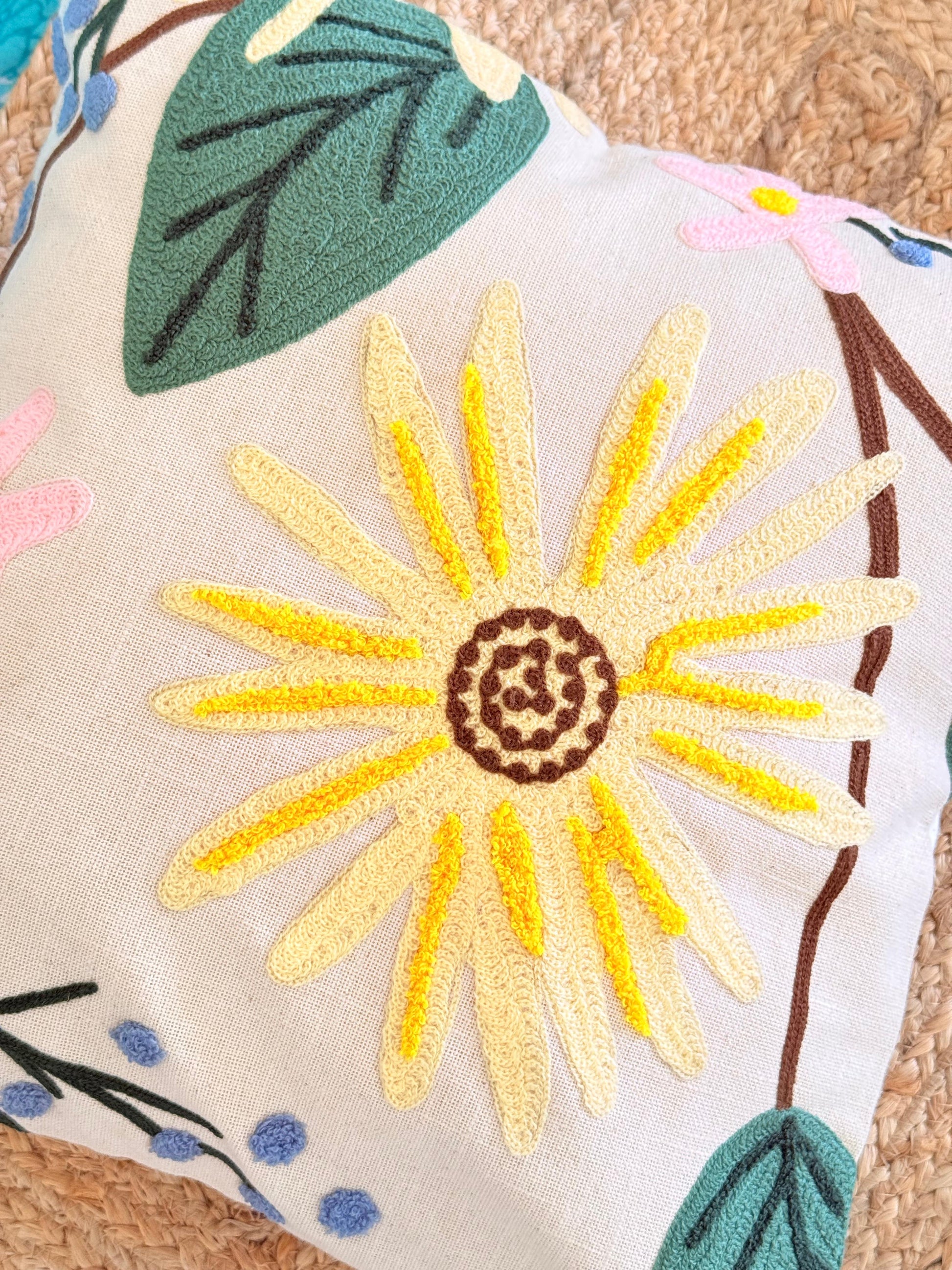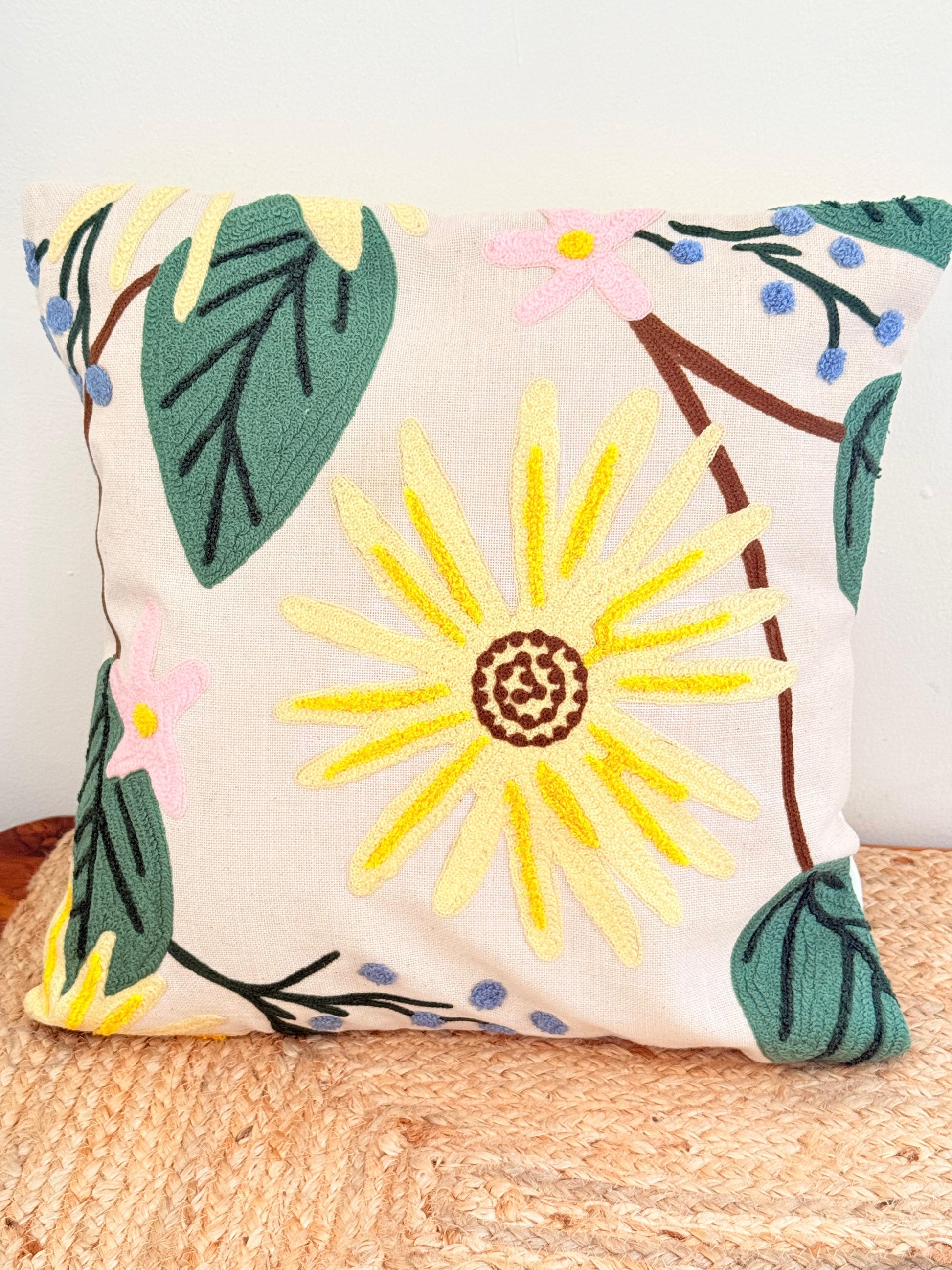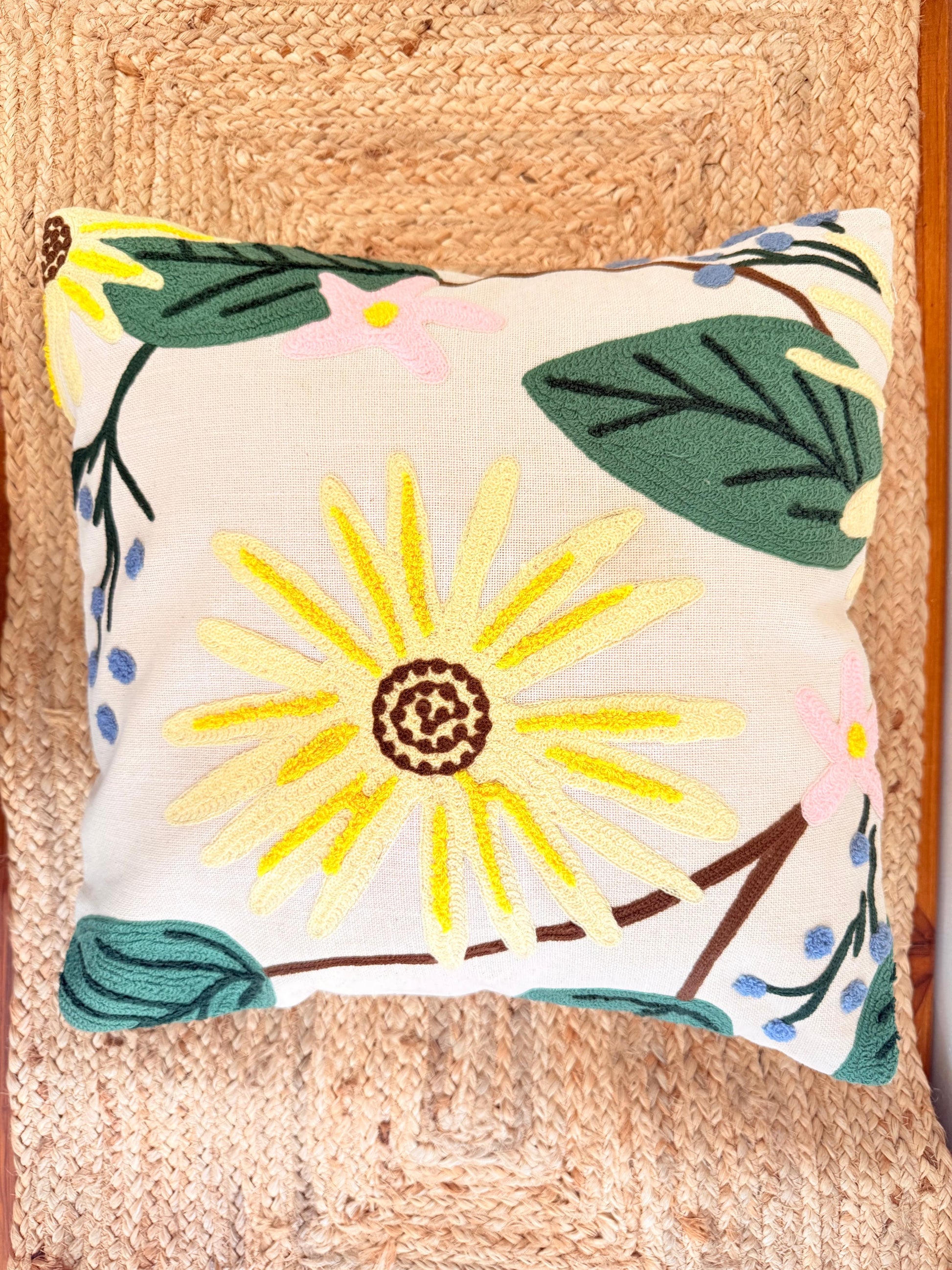 Yellow Flower Embroidery Decorative Cushion Cover – Premium Jute Throw Pillow Cover