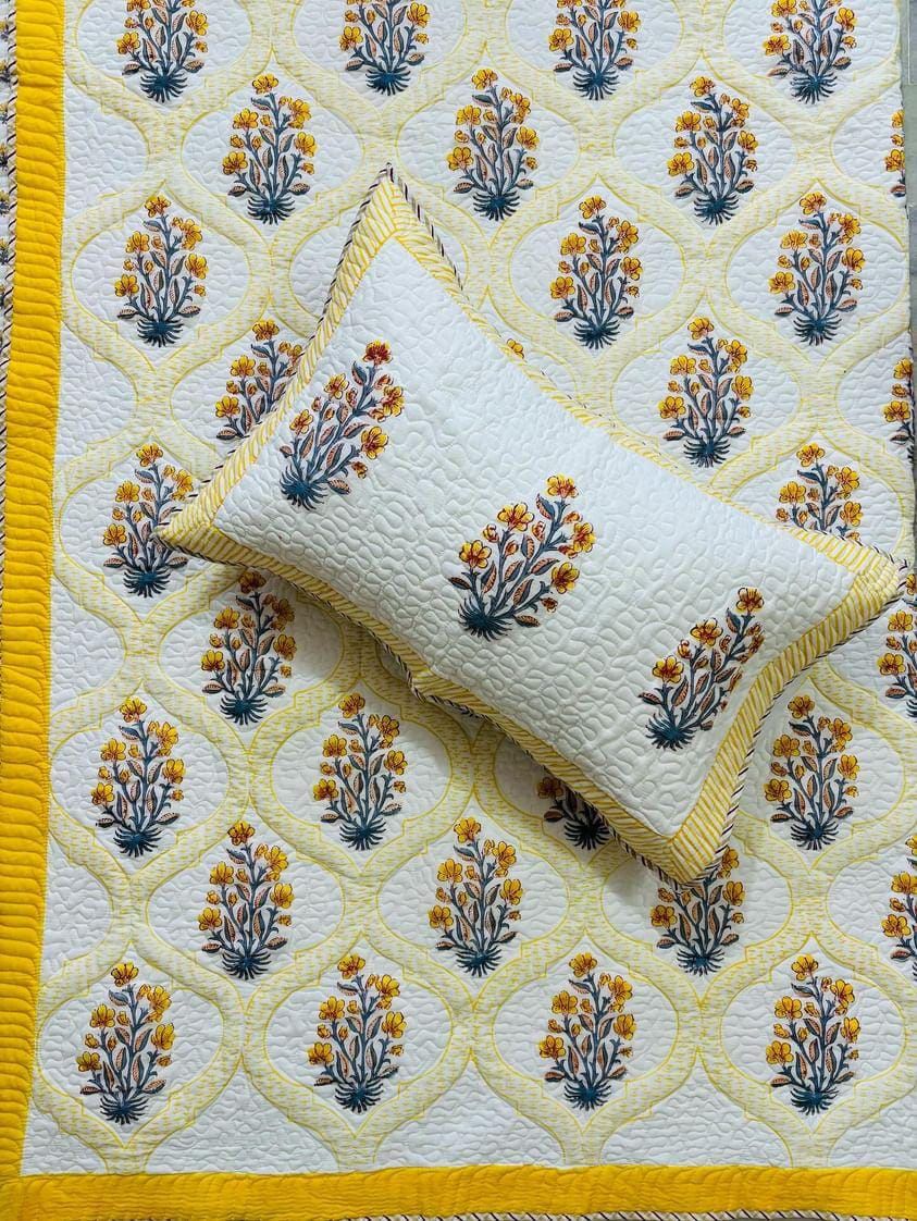 Yellow Flower Handblock Quilted Reversible Bedcover with 2 Pillow Covers – Premium Cotton, Elegant Home Décor