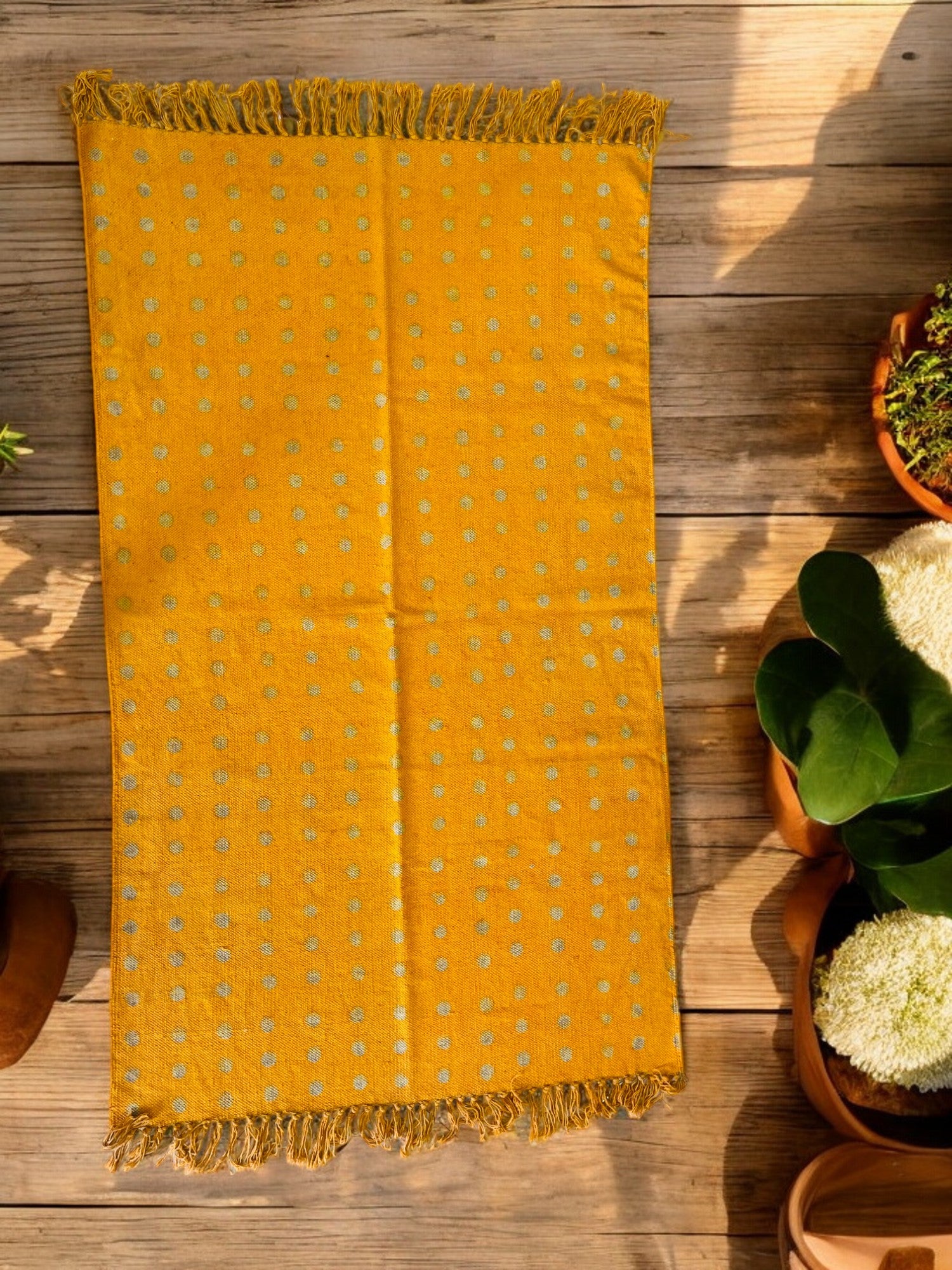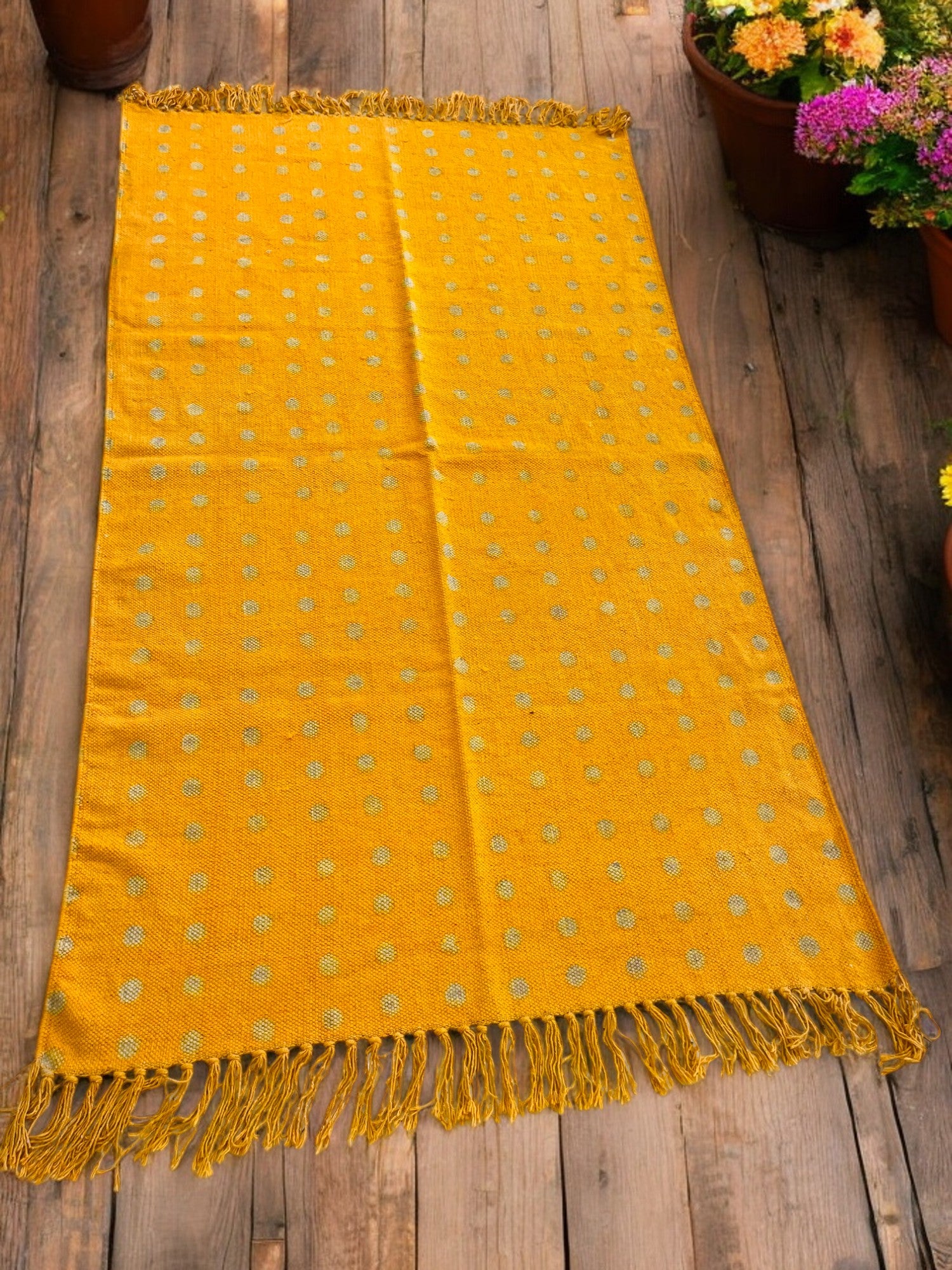 Brighten up your space with this Yellow Handblock Print Cotton Rug, sized 3x5 ft. Made from 100% premium cotton, this handcrafted rug features intricate handblock prints, combining traditional artistry with modern design. Its vibrant yellow tones add warmth and elegance, making it perfect for living rooms, bedrooms, hallways, and entryways. Designed with eco-friendly dyes, it is safe, sustainable, and long-lasting. Lightweight and versatile, this decorative area rug enhances any decor. Dry clean only for easy maintenance. Elevate your home decor—order now and bring timeless charm to your interiors!