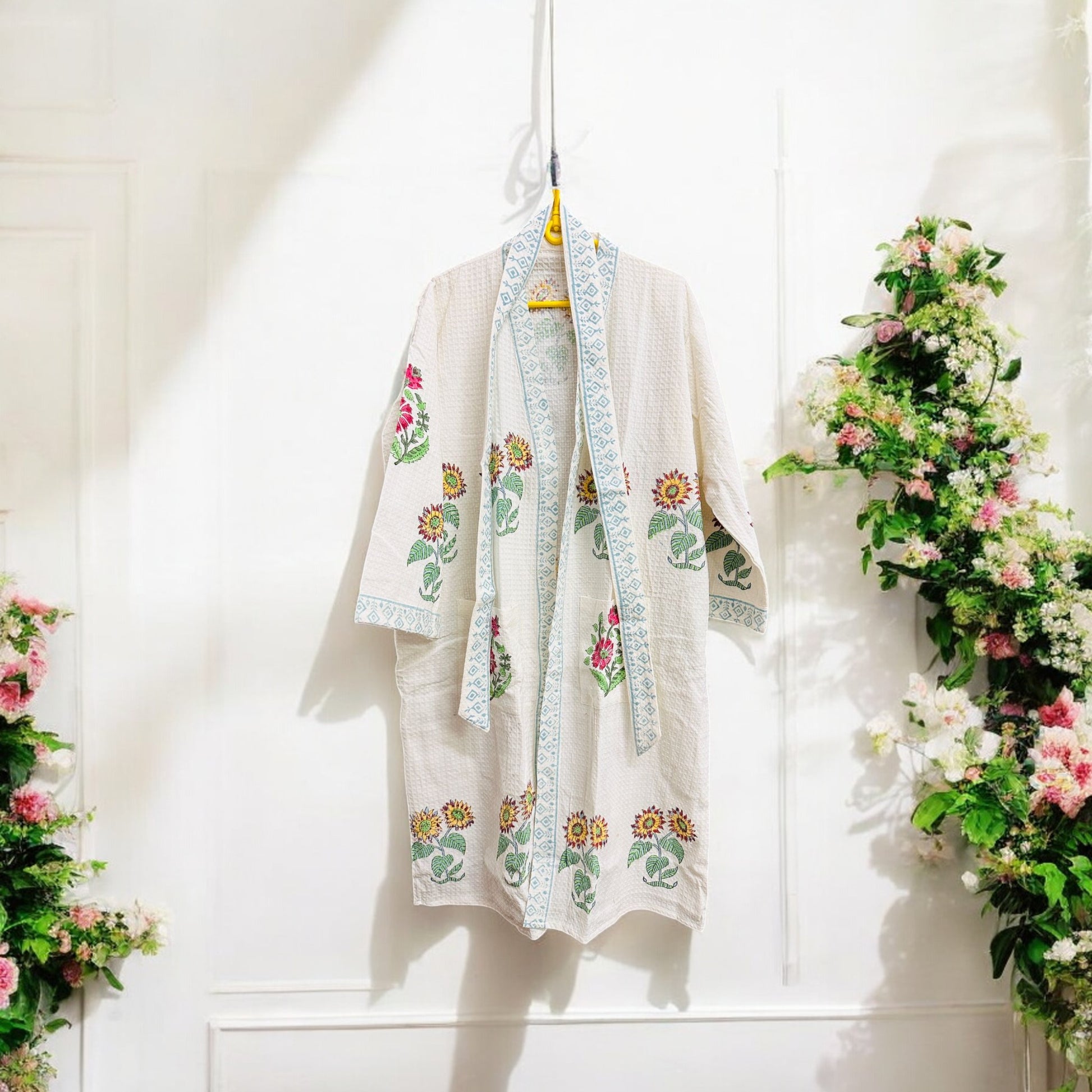 Yellow Sunflower Print White Handblock Bathrobe – 100% Cotton, Soft and Elegant