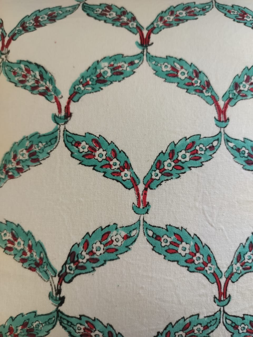 • Handblock Print Design – Intricate green and pink floral patterns crafted using traditional handblock printing techniques.